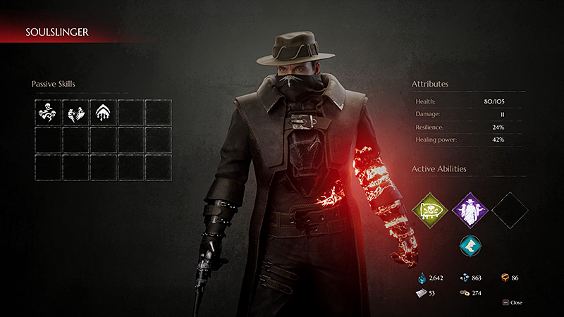Soulslinger's combat system is not only based on western-inspired firearms with a unique afterlife touch, but also on powers. There are a number of essences between which you can choose, and these essences mostly offer active abilities as well as passive skills. For example, there is the "Fire Essence", "Electric Essence", "Toxic Essence" and the "Shadow Essence". For the Early Access release there will be these 4 distinct essence classes in the game. Additional further essences will follow up until the full release.