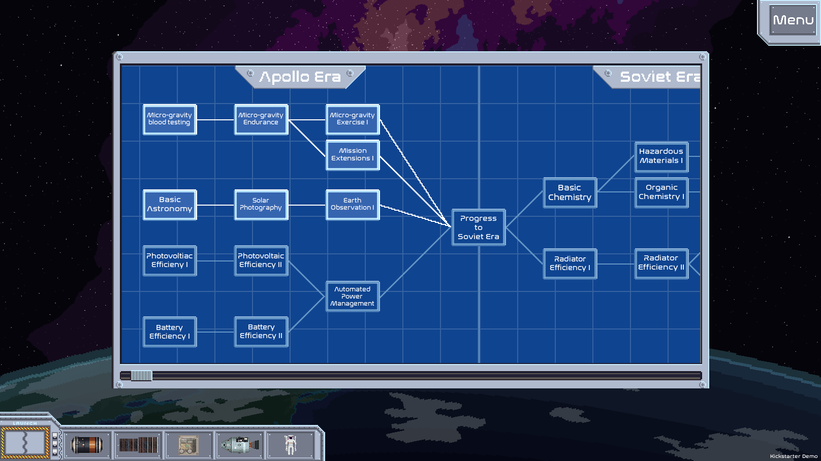 Developing all of this equipment and technology for your station will take time and resources. With the right balance of power, heat, supplies, and crew, you'll find yourself moving up through the technology tree and onwards through the eras of spaceflight.