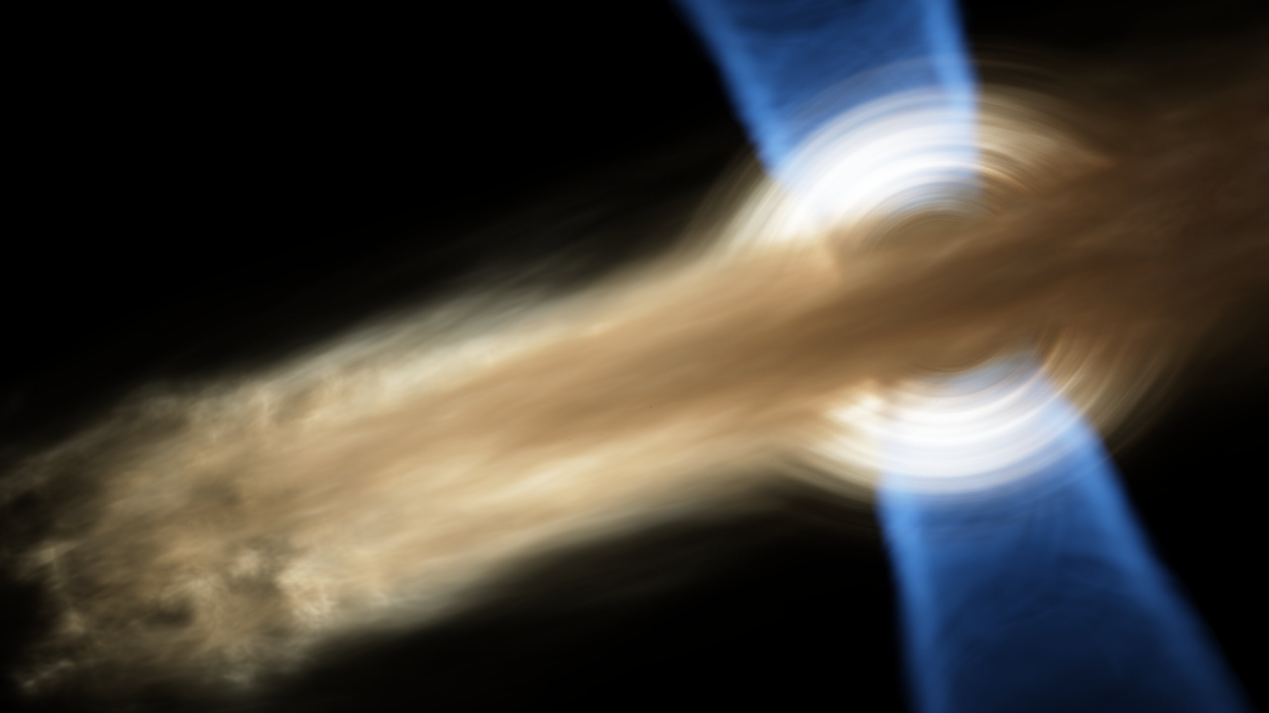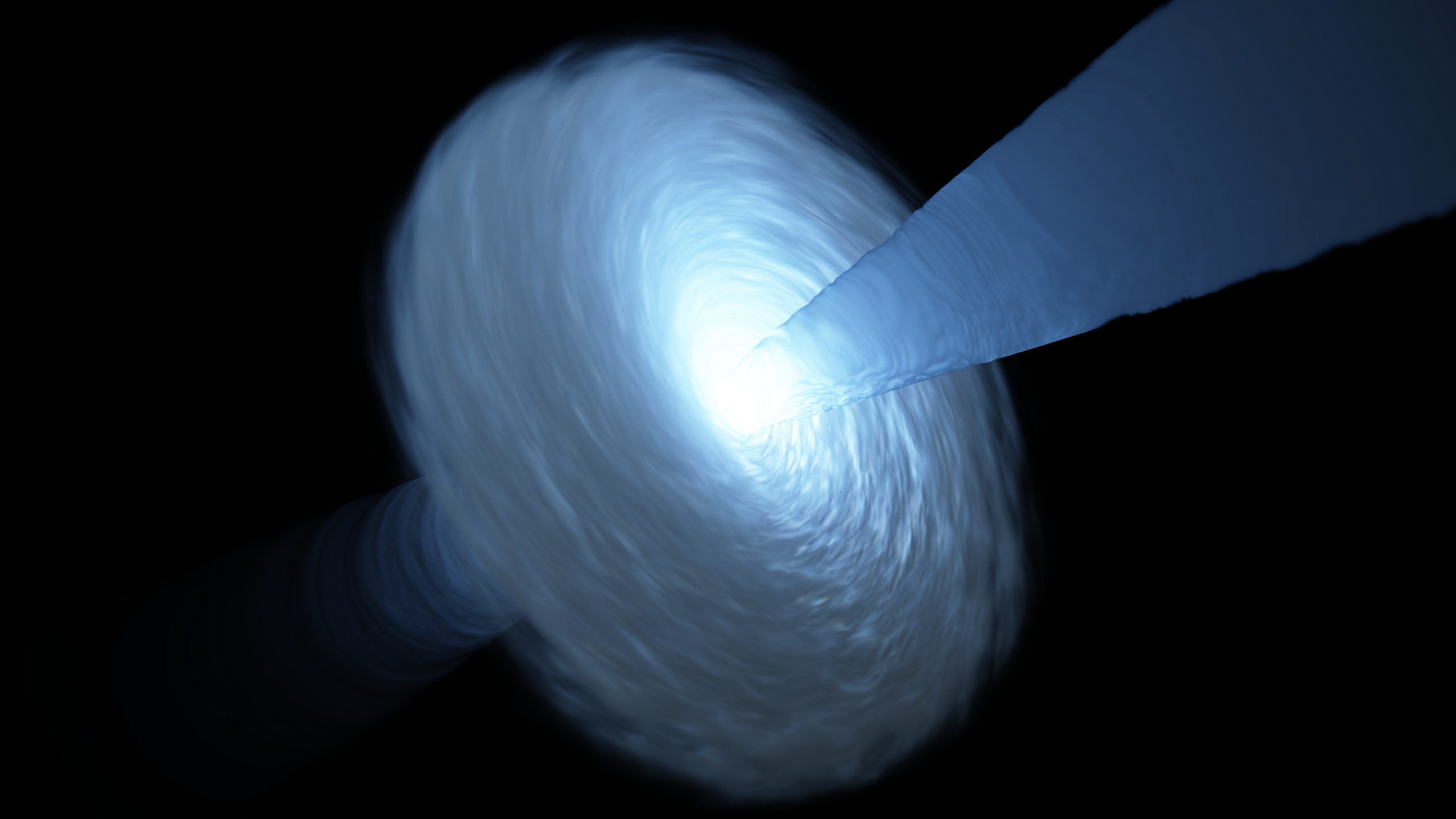Accretion disks are also fully animated, as shown in the video below, and incorporate astrophysical jets – powerful streams of very hot matter ejecting away from the plane of the disk at almost the speed of light. Old versions of SpaceEngine used sprites to render jets (similar to comet tails), but that was a “quick and dirty” solution. Since those “jets” were rendered separately, they were not warped by the gravitational lensing effect, and looked out of place. Now, with everything rendered by a single shader, the jets are correctly warped and show the correct effects; but this adds the limitation that jets cannot be very long, since they can’t go outside the shader rendering volume (which is a sphere, typically limited by the edge of the accretion disk).