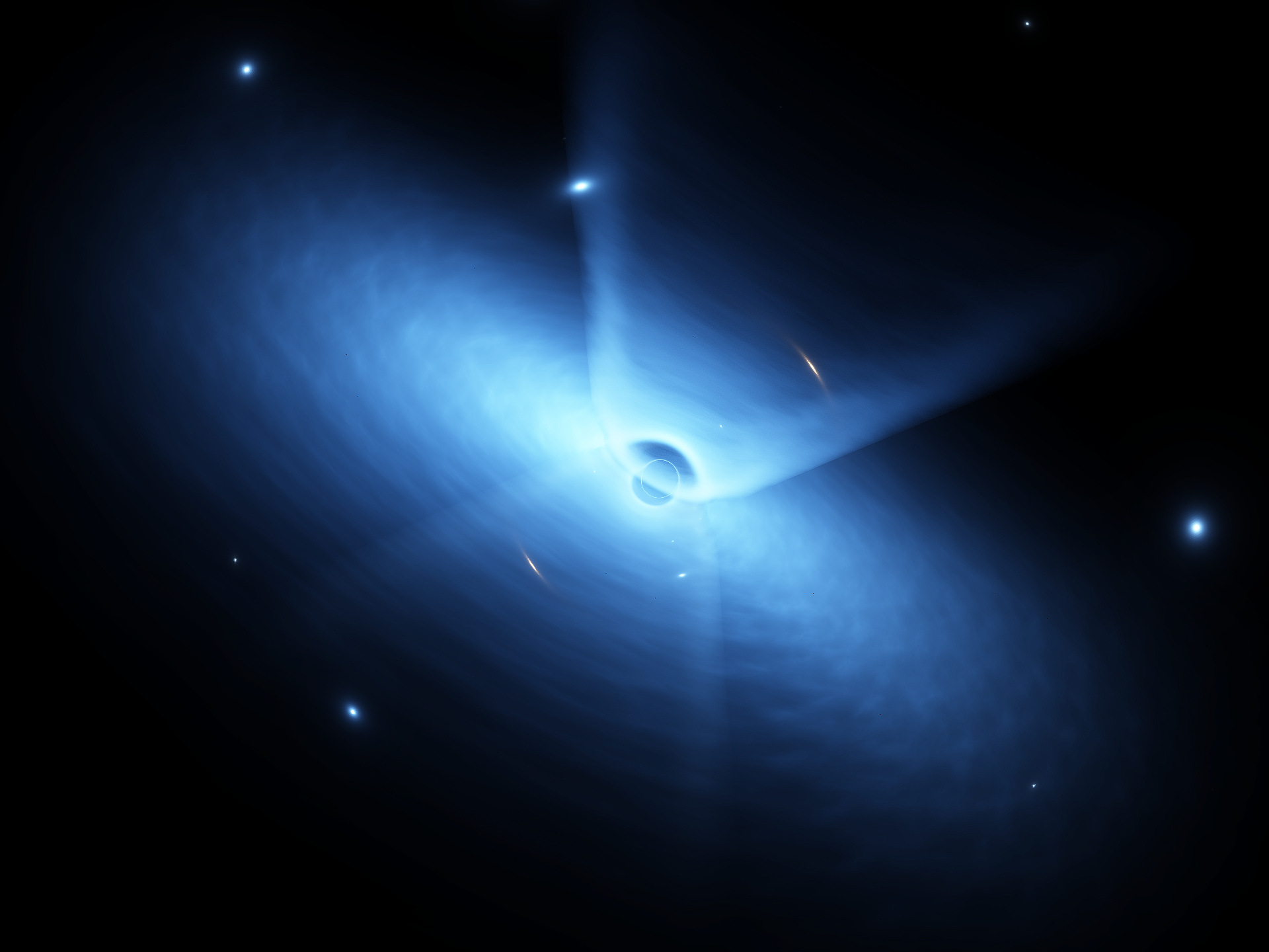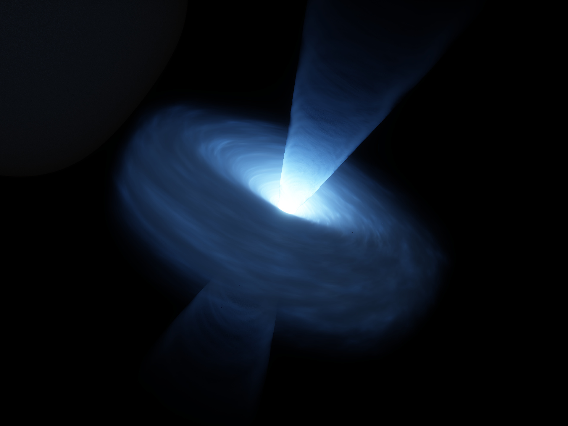 [i]Microquasar SS 433, powered by an 8 solar mass black hole. Its white supergiant companion star is barely visible at the top left.[/i]