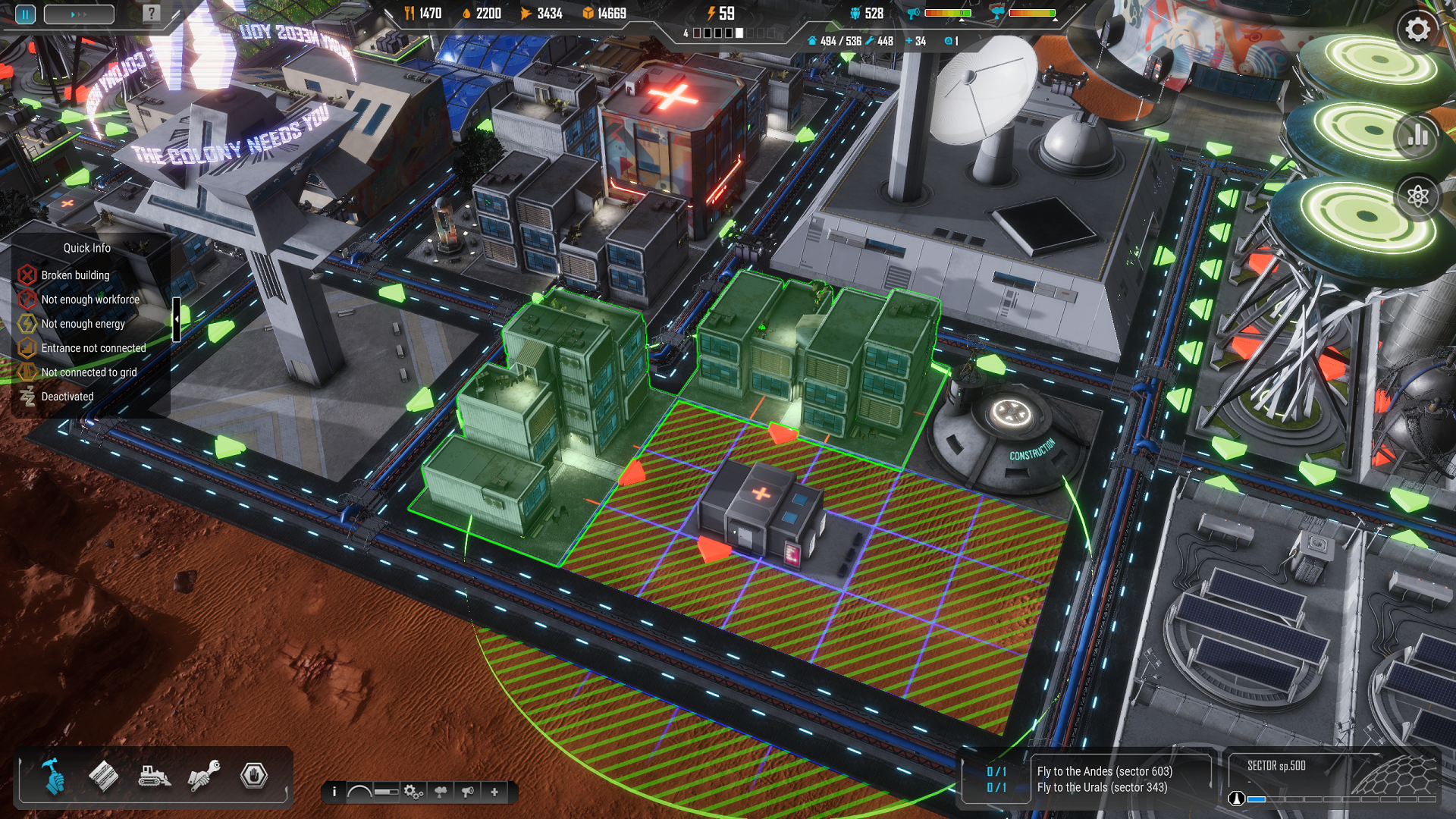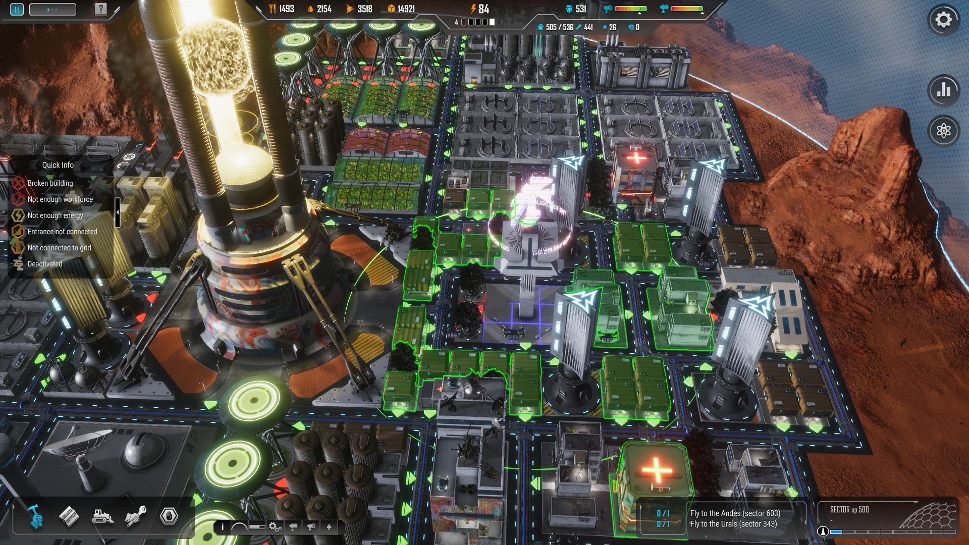 The maintenance station provides automatic repair of damaged buildings within its area of influence. Its radius of influence and that of medical buildings can be increased by various technologies. Positive areas of influence are displayed in green and negative ones in red.
