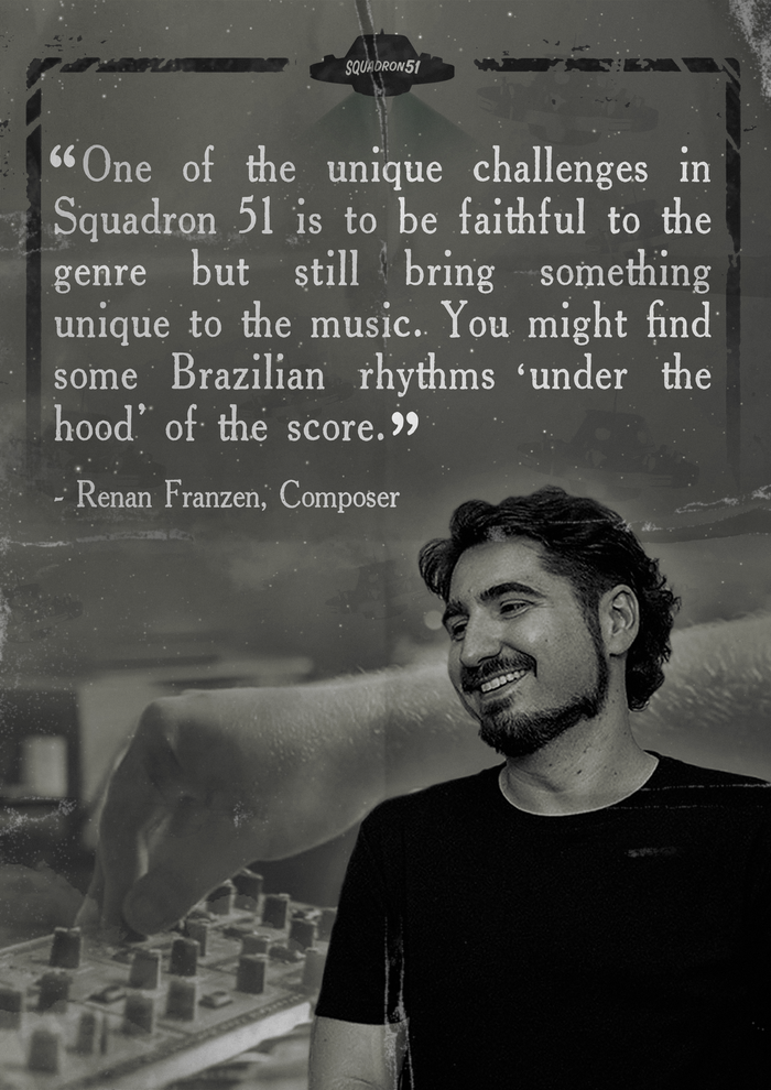 Our composer, arranger and orchestrator Renan Franzen is a fan of sci-fi films and games since he was a kid, and we’re glad to count with his passion for the genre in our project. As a composer, he has created music for a variety of genres and formats, from a handful of horror films to crazy sitcoms and the recent futurist sci-fi teen flick Tales of Tomorrow (2020). In his own words, “One of the unique challenges in Squadron 51 is to be faithful to the genre but still bring something unique to the music. You might find some Brazilian rhythms 'under the hood' of the score”. You can listen to his work on his official Spotify channel! And below you can listen to an exclusive track of Squadron 51's score, the theme of the first level, "The Discovery of a New World".