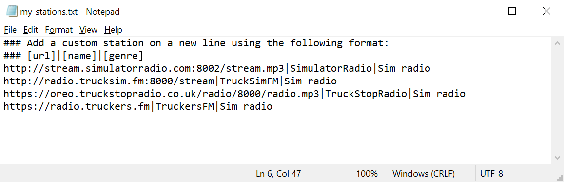 The first time you change station the game will generate a text file in your documents folder. You can add station / stream information to this text file to access it in-game.