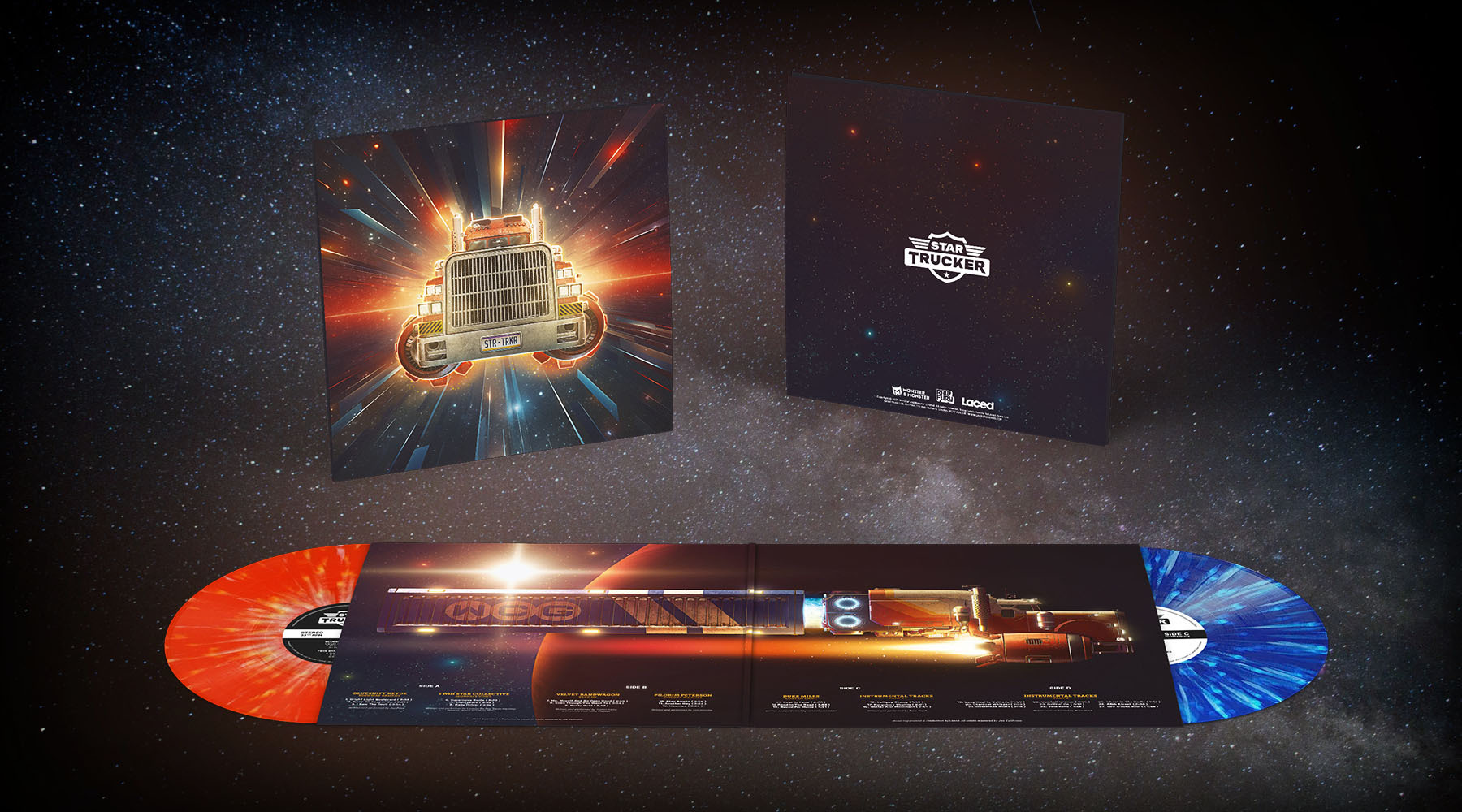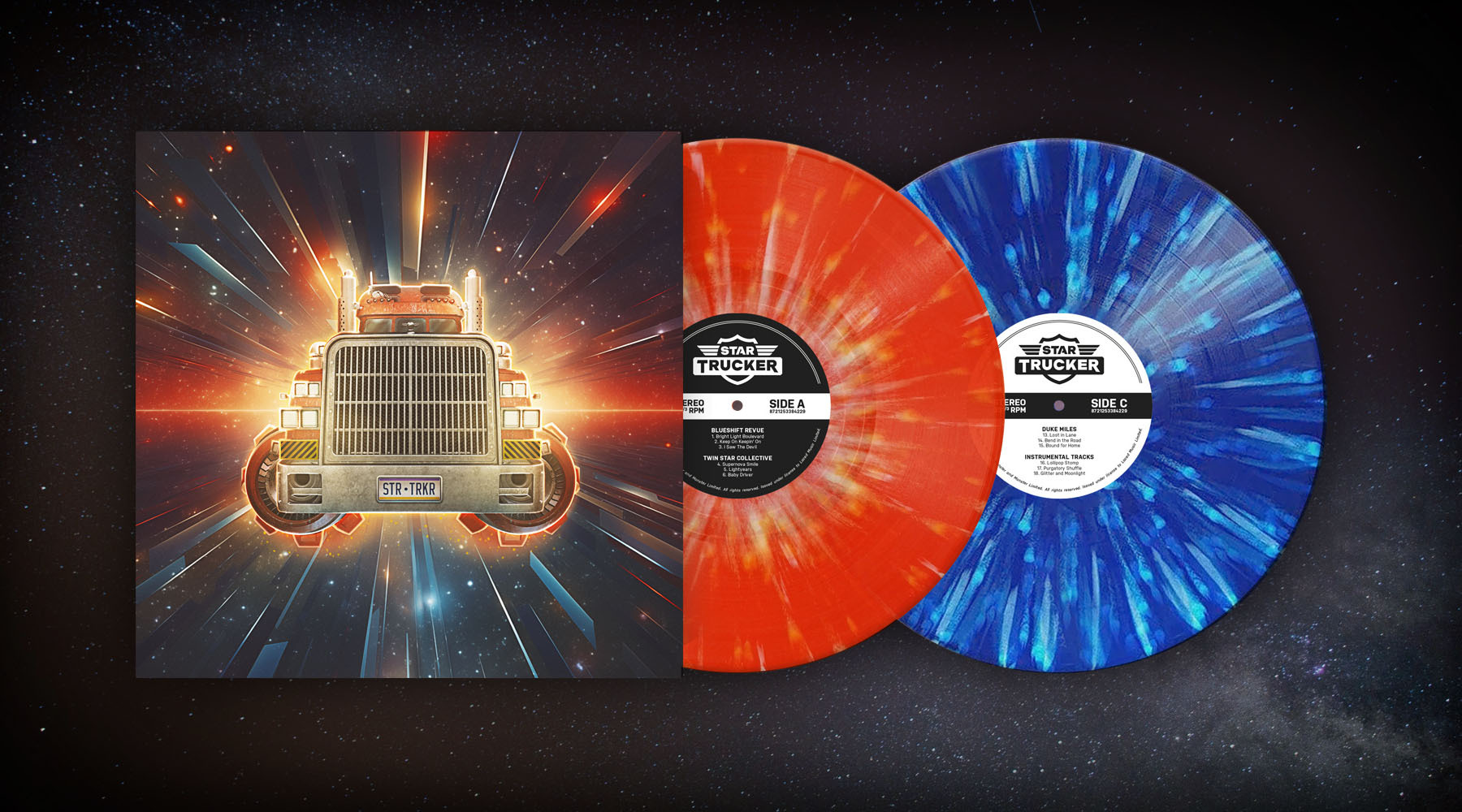 Heavyweight splatter vinyl, in orange & white and light & dark blue: Preorders are open here:- [url=www.lacedrecords.co/collections/star-trucker][b]US Store[/b][/url]
