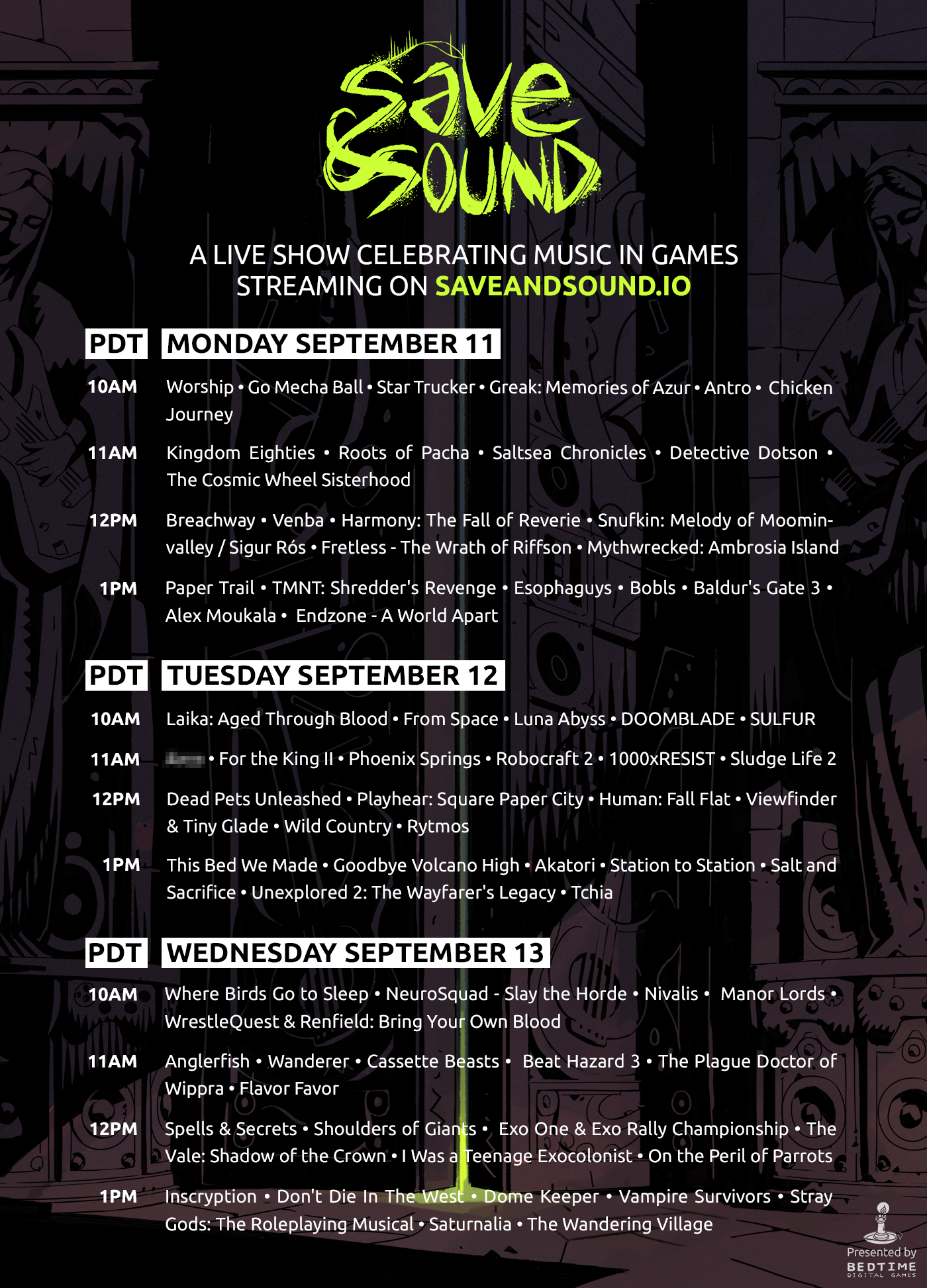 Set a reminder to be notified when Save & Sound will go live! The show will be streamed on the Save & Sound website, YouTube, and Twitch. Check out all the games part of the event on [url=saveandsound.io]saveandsound.io[/url] https://store.steampowered.com/app/2380050