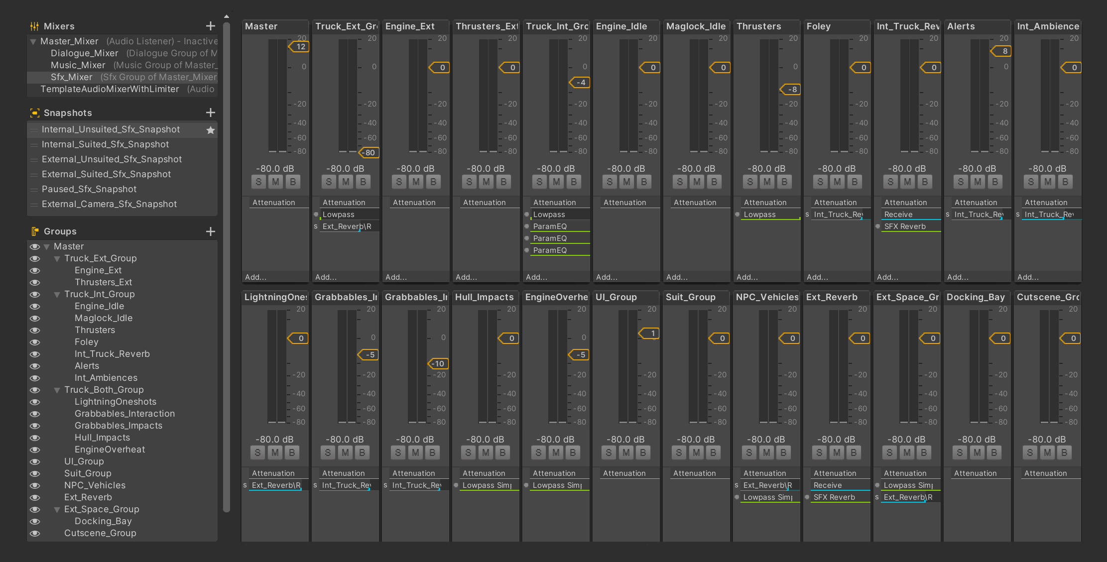 This kind of exercise can help to give you a solid footing when it comes to defining a structure for the mix. Practically speaking, the way we went about rationalising this prioritised list in the mix is by using volume ducking on various SFX groups using Unity’s audio mixer functionality.