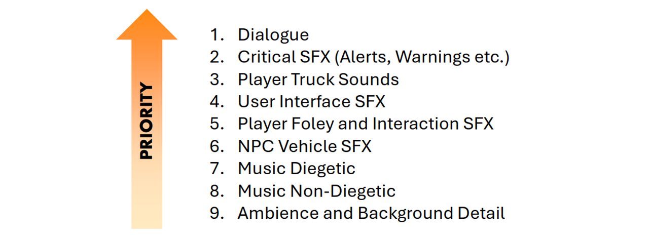 In the previous post I talked a lot about the sounds of the star truck. While arguably the most important overall, this is only one part of the Star Trucker audioscape. In the final mix, we need to consider other sounds such as dialogue, music, user interface, foley and truck alert sounds. I generally like to list categories of sounds in order of importance. This can be different for every game but for star trucker we end up with a hierarchy like this: