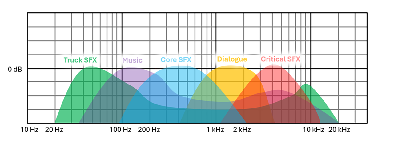 Similarly, the frequency profile of the truck is designed to have a lot of energy in low mids, and also some higher frequency detail, leaving some room in the mid frequency bands for other audio like music. I try to keep a mental map of where in the frequency spectrum each category of SFX or music will live during both the sound design and the mix process. In my head it looks something like this: