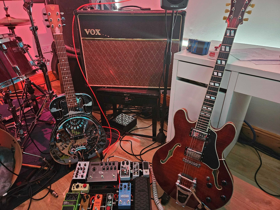One thing that I drew a lot of inspiration from is the visual aesthetics that Dave and Dan had so wonderfully realised in Star Trucker. I loved how real the truck looked and felt. The truck bears signs of wear and tear with visual scuffs and dings showing a vehicle that has a history of use. In this sense I really wanted to write music that felt quite raw and unpolished in some senses. This approach allowed me to generate a lot of music very quickly, with tracks coming about from quick sketches, improvisational jams and performances often captured in one or two takes. As such, I’d like to think the instrumental tracks are quite human feeling. There were no click tracks, sometimes the guitars were a bit out of tune and there are audible scuffs and dings to be heard if you listen closely.