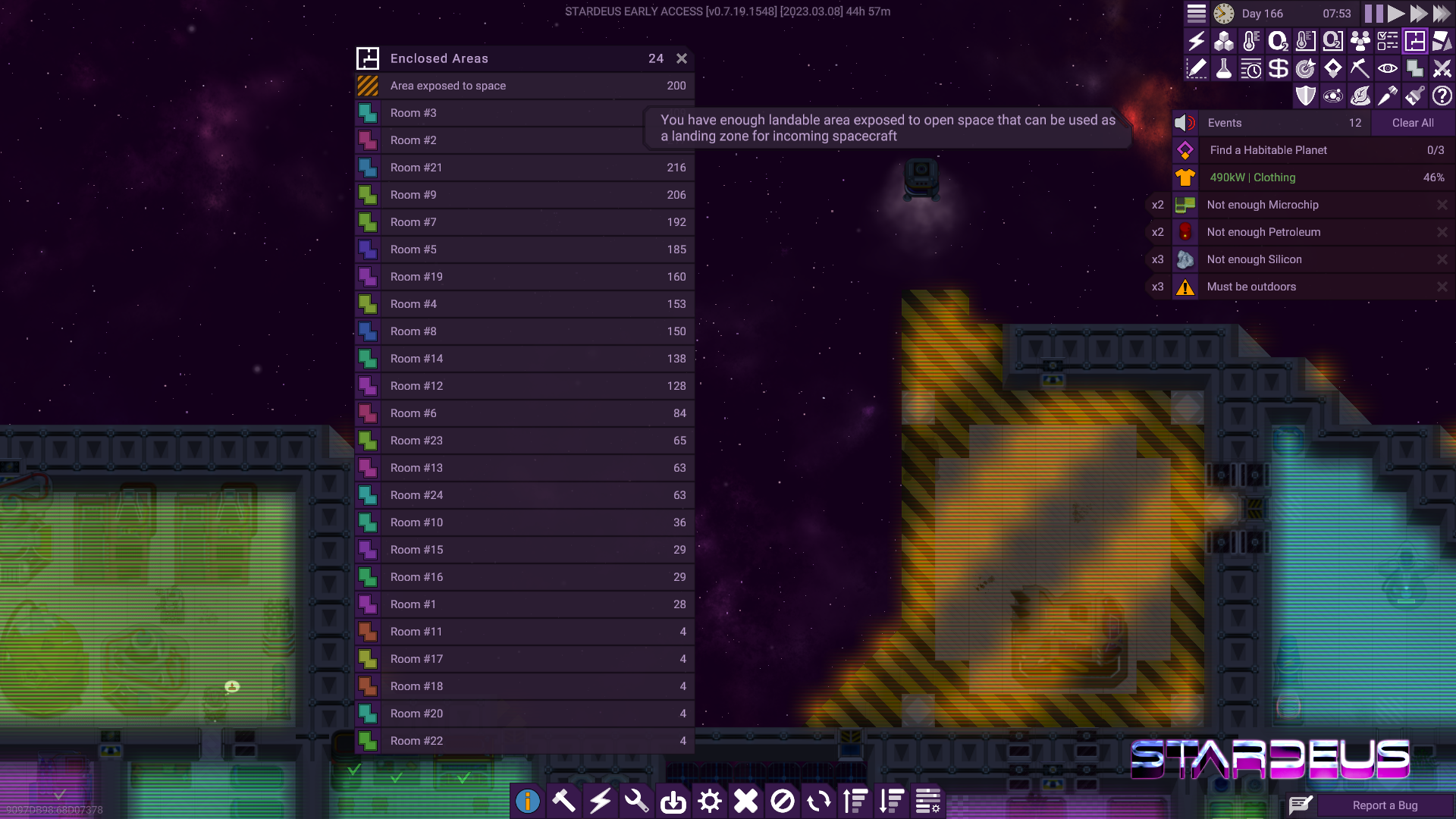 A full rewrite made the room change detection so fast that I don’t even have to run it in the background across multiple frames anymore. You may notice a significantly faster ship generation when starting a new game, this is thanks to this rewrite. The performance boost is also noticeable when you have a large amount of ongoing construction that makes the rooms / sections to constantly reevaluate.