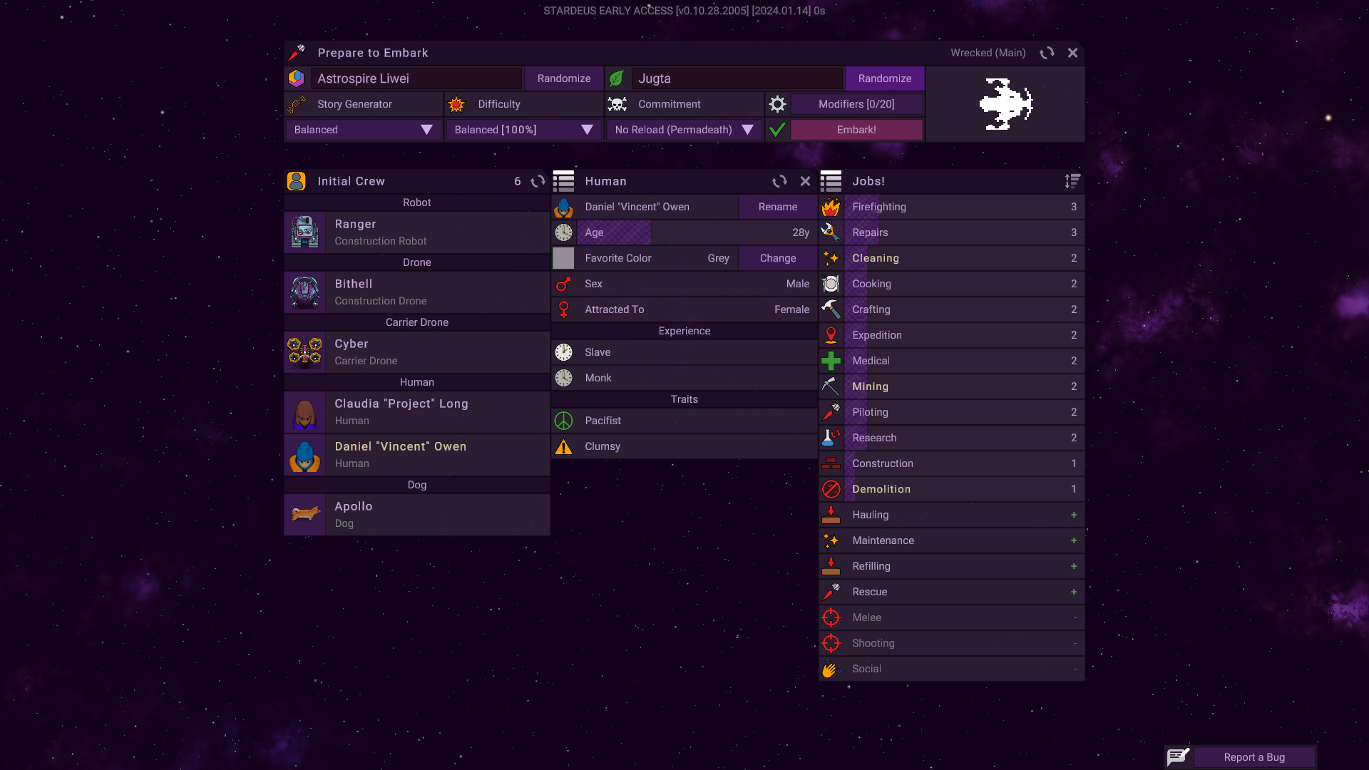 Stardeus will have a new game setup screen. You will be able to randomize your starting crew, customize their names, and see their skills.
