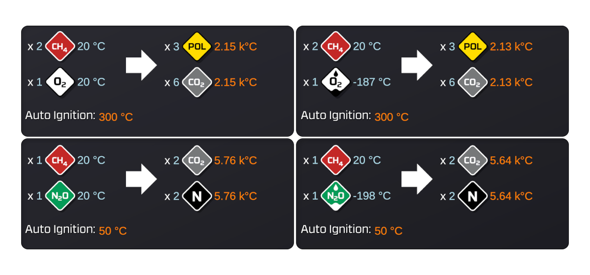To help make sense of the new chemistry, the Stationpedia gas pages now include a Combustion Info Panel. This shows the input ratios, auto-ignition temperature, and output products for any gas that will combust with the one you are currently viewing.