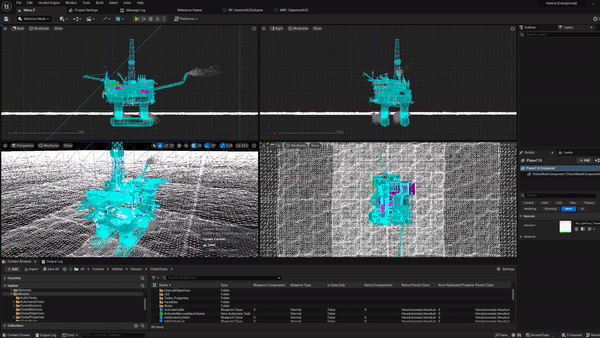 → Explore and Discover: Seeing the beauty in horror "Explore and Discover" is one of our game pillars, so in a typical Chinese Room fashion the first thing we wanted to try out was to find beauty in the horrific changes around you on the rig. We set the bar really high, and wanted to create an environment that feels real, scary, and weird. Epic's Unreal Engine 5 is the perfect choice for this. We want to give the players the best experience on both desktop PCs and consoles. It is a powerful modern rendering engine that allows us to be creative. With Lumen and Nanite we can now explore real-time lighting and give fine detail in our scenes." And of course, the rig is located in the North Sea, so we need to have stormy weather - rain, wind, rough seas, mist, gusts - Niagara (Unreal Engine's next-generation VFX system) allows us to plenty of freedom in this area. We also used ControlRig (the scriptable rigging system) extensively for procedural animations - but more on this later."