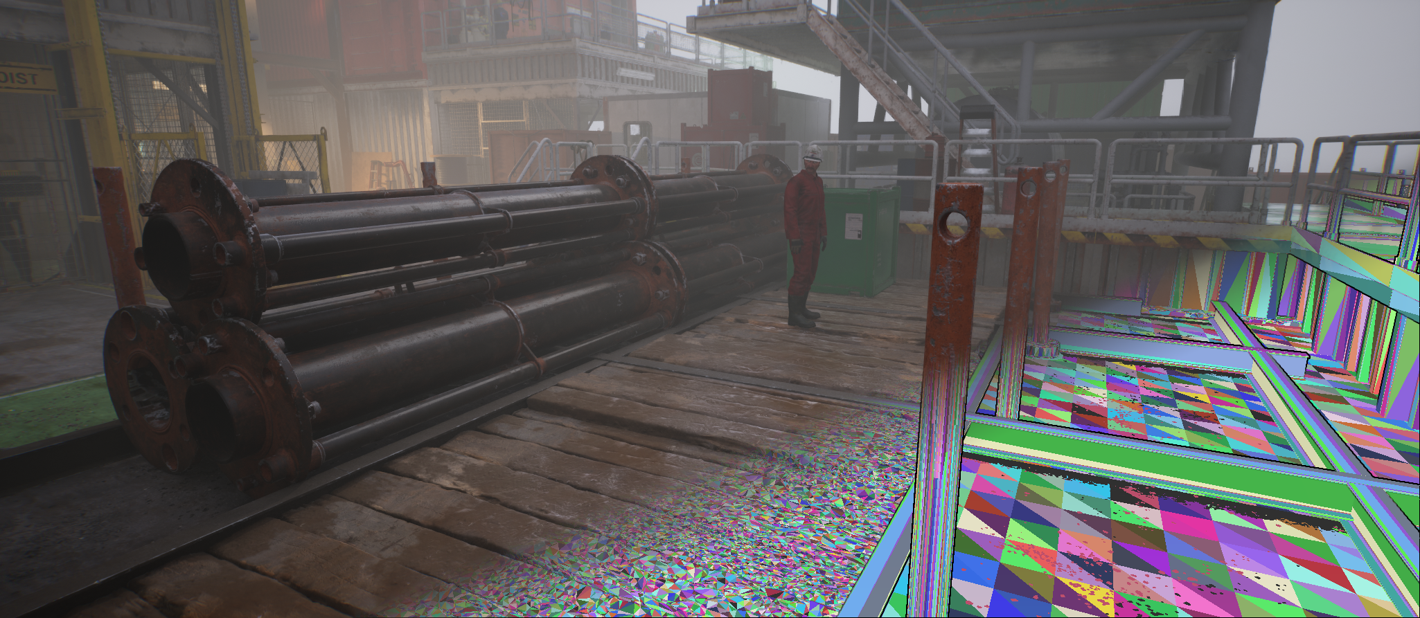 After doing extensive research into finding solid reference images of the time period and oil rigs, all that was left was figuring out our technical pipelines and workflows to achieve the best we could with a limited number of people. Personally, I’m a huge nerd when it comes to figuring out these pipelines and workflows, so I had a lot of fun figuring out our options together with the team. In the future, we might try to share more of our solutions for maximising texture resolution and mesh quality. Something that was coincidental with our project, and extremely helpful, was the release of Epic’s new tech called ‘Nanite’. Suddenly we could leverage the GPU to add more detail to our 3D objects in a way that was previously not possible.