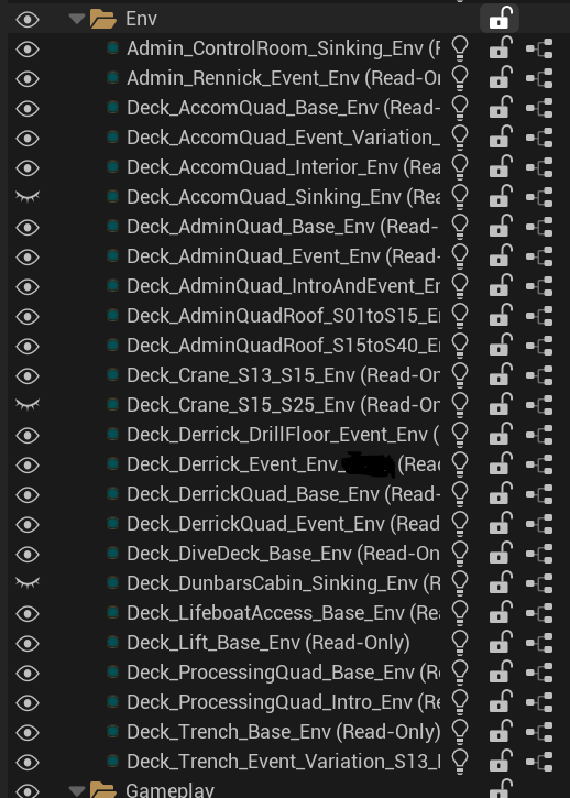 [b]→ The changing environments - lessons![/b] There’s a theme in[i] Still Wakes The Deep[/i] – transformation and change – that we wanted to reflect in the level design from the very beginning. We wanted the evolution of the rig to be starkly foregrounded as one of the main areas of player perception of place. To this end we included many scenes where you return to previous areas… but they’ve changed – either through flooding or destruction. Early on we also identified this as a cost-saving – rather than making whole new areas we can just re-use and alter existing areas! How clever we thought we were! In fact, this did not lead to a promised land of free environment art. If anything it made things more challenging. If we wanted to move a door or to extend a corridor, or alter any other minor piece of the environment layout, we had to make this change in multiple versions of the scene. This actually increased the cost. We made sensible accommodations – putting base environment structures in a single shared sublevel or layer for example, but still… once damaged versions of doorways or walls go in, it’s not something you can change just once. Regardless of this painful lesson, we’re pleased and proud that as the game proceeds, you will get to see the Beira D change and evolve, as always intended.