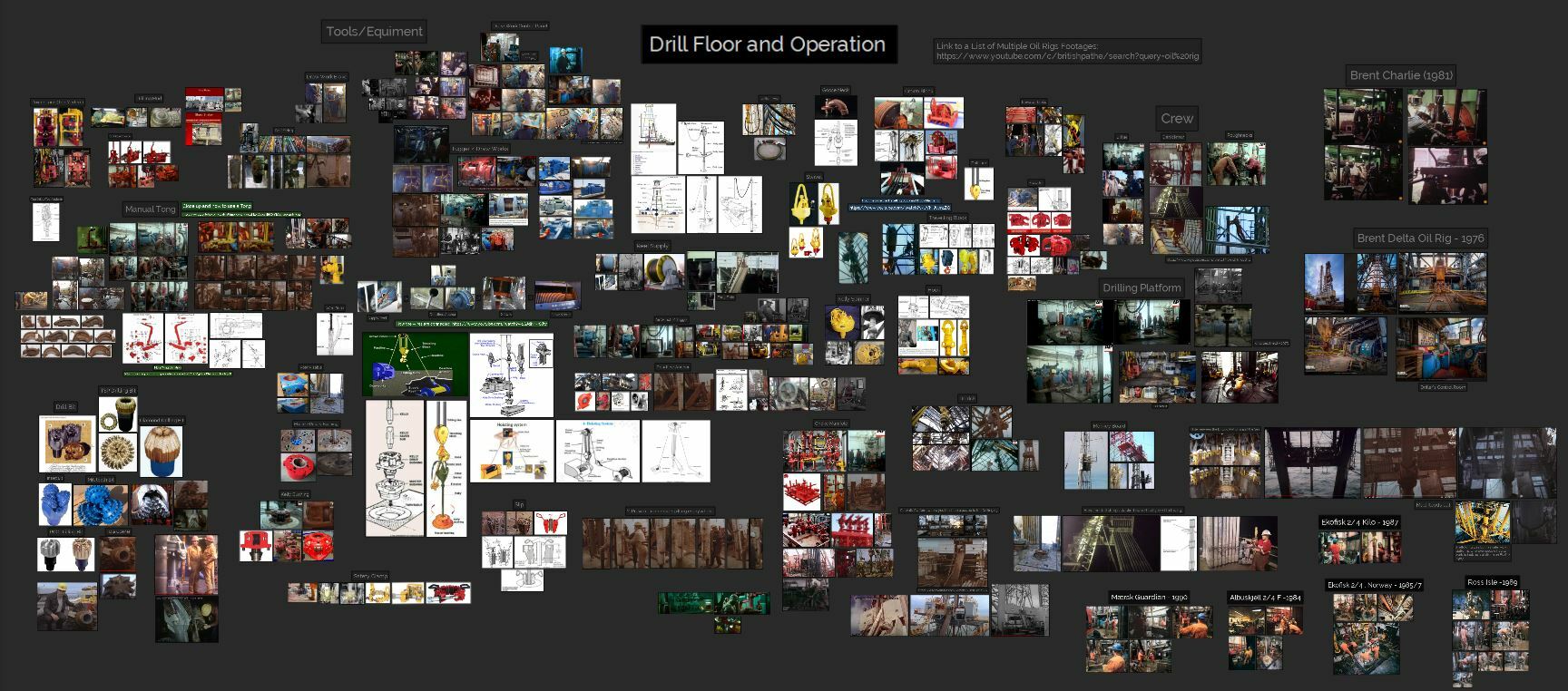 [b]→ Research / Moodboards[/b] The Art team is incredibly busy with the latter stretches of game development so we asked Environment Artist Gabriela Woch (who is now working on another project in our studio) to tell about how she helped with the research for the environments we see in the game, that were collated at the beginning. Gabi's extensive mood boards and meticulous notes helped to bring about to much of the game's eventual atmosphere! Here is her text on her process: The purpose Before we even started, we knew that we wanted to make the characters and the story as grounded as possible. And given the event was planned to take place in the 1970s in the North Sea, we realised that we needed to do the research. How come it's me doing it? This was a team effort with almost everyone taking part in the research. However, given that I have a degree in Costume, where most of my role as a costume designer was to investigate the fashion for the time period of any script I was given, this task fell nicely into my skill set; so I undertook most of the research for Still Wakes the Deep. The fun The most fun and interesting part of my job was watching many video archives. Not only did they provide exactly what we needed in terms of aesthetics for the rig, but also how people interacted on their steel island, particularly about how they communicated and worked with heavy machinery. These insights gave us many ideas for the design of the game as well as creating an atmosphere that looks and feels real. The hardest part The tricky part of the research was making sure the assets we were finding were not American as they tend to pop up more in the media than British versions. The other challenge was that if I was looking for an object that I couldn’t find a reference for in time, I would have to improvise by sourcing references from either genuine photos of that era or watching Scottish and English documentaries, television shows, and films. Even so, we still occasionally needed to change some of the props during production when we realised those objects didn’t actually exist during the '60s and '70s. If I have to pick and choose my favourite Mood boards, the first one will have to be the first research I ever conducted, as it cemented my role as the Researcher for the project.
