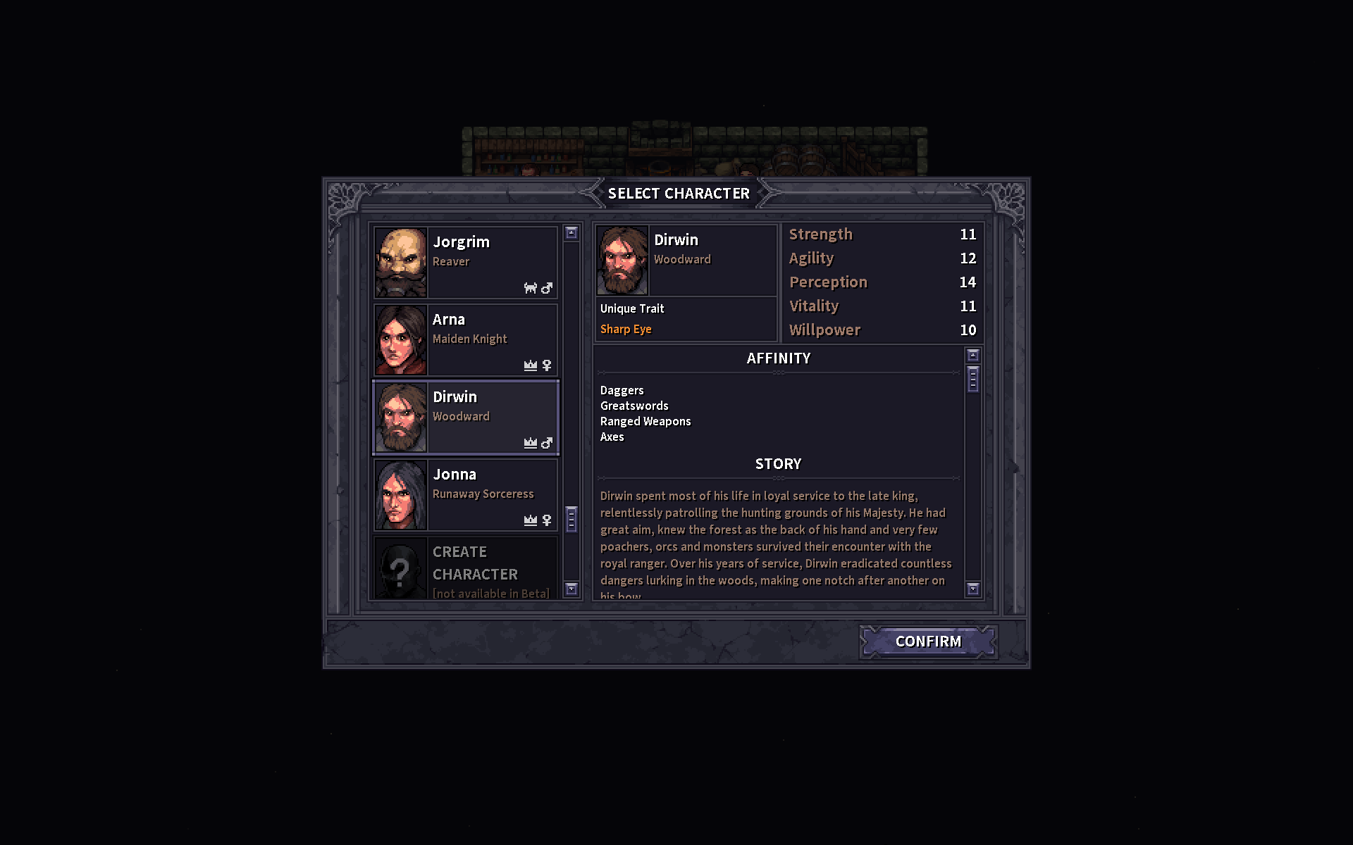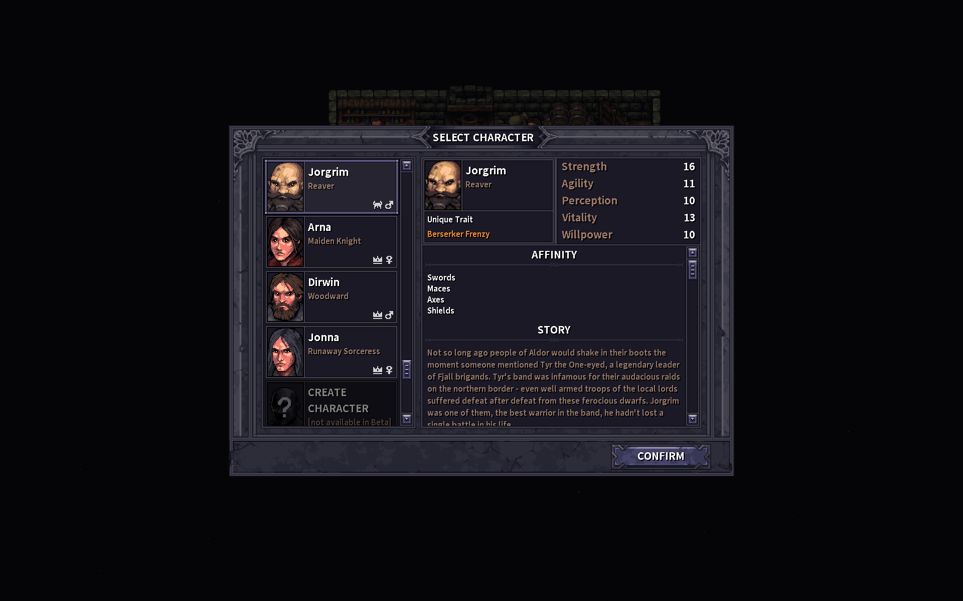 We intend to expand this system at the same time as working on the character generator. According to our plans, some heroes will have access to unique content, which can’t be discovered when playing as other characters. For now this type of content is represented with unique starting equipment. For example, Arna starts the game with a family cuirass and sword, which can’t be obtained in any other way. We also plan to expand the character selection as we add more skill trees.