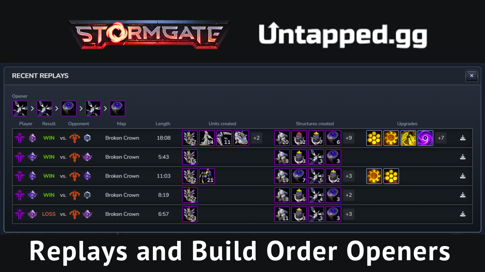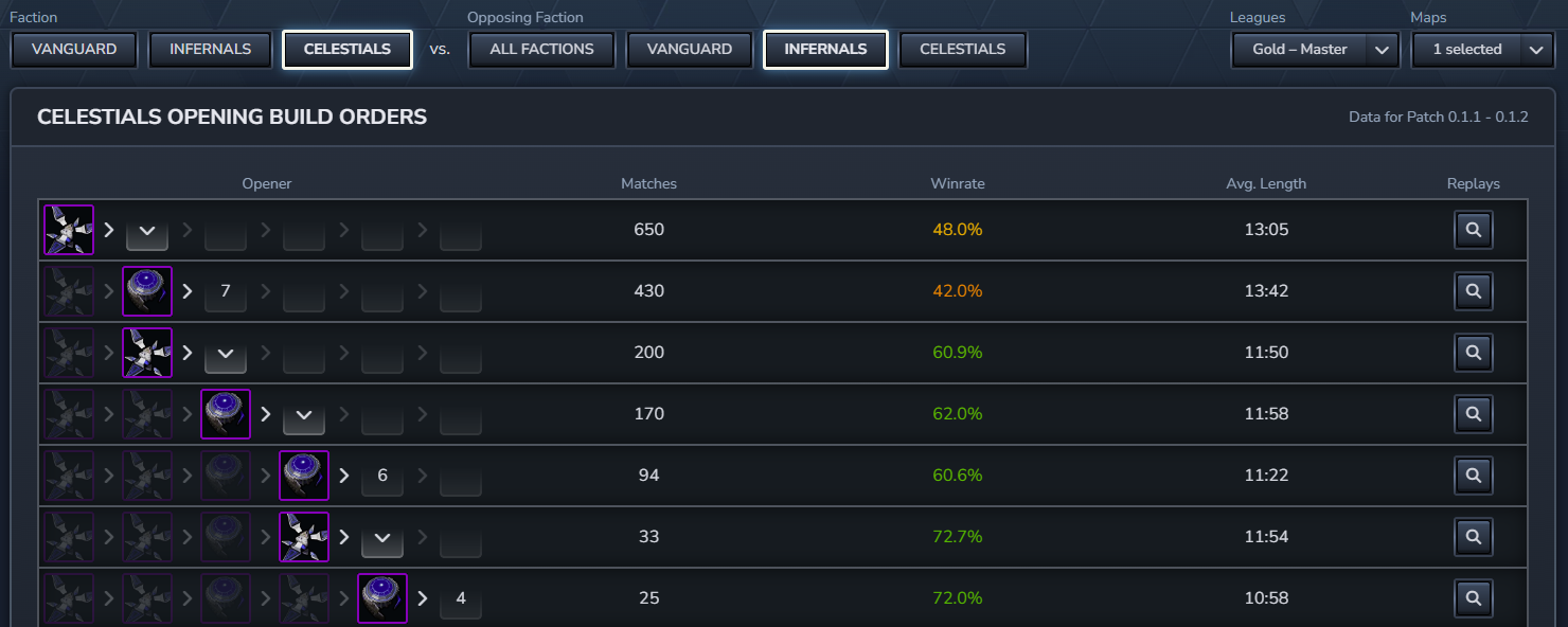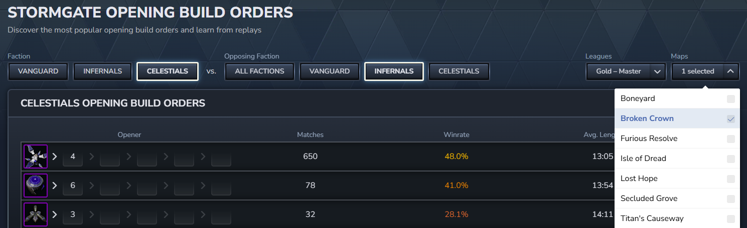Starting today, you can visit the [url=https://stormgate.untapped.gg/openers]Stormgate Untapped.gg page[/url] and click on the OPENERS tab at the top of the nav to discover the most popular and successful opening build orders for your favorite faction. Maybe you specifically want to improve your results as Celestial vs. Infernal on Broken Crown as you’ve been struggling?