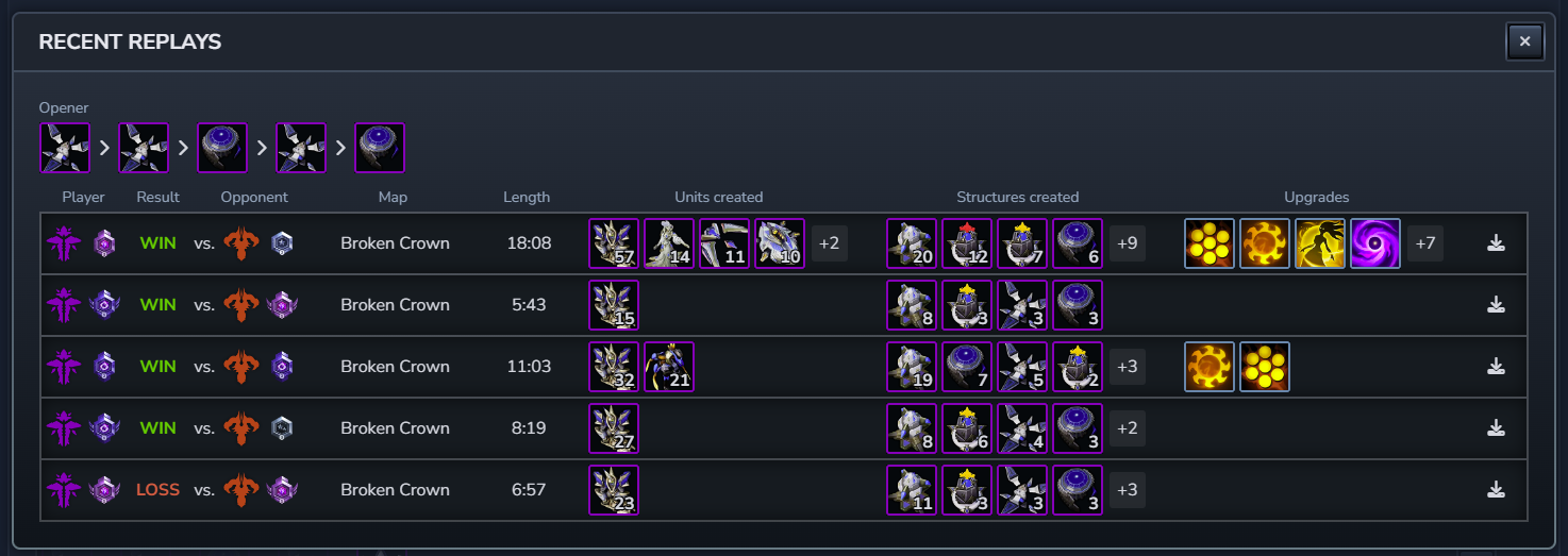 Let’s dig in deeper. You can click on the magnifying glass on the right to then check out match replays where you can see these build openers in action. This view shows you the units and structures created as well as the upgrades that player picked. Don’t worry if you’re a competitor and don’t want your strats shared–these games are anonymized as “Player 1” vs. “Player 2”, so your strats will be a secret unless you opt into sharing your replays with the public.