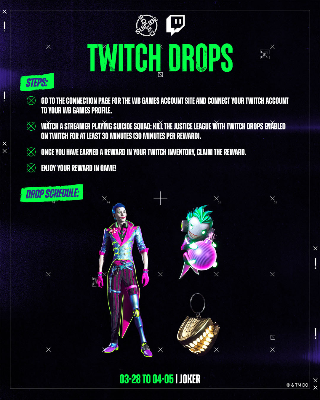 The release of Season 1 will see the return of Twitch drops for Suicide Squad: Kill the Justice League! Just connect your Twitch account to your WB Games profile and from March 28 to April 5, you’ll be able to earn unique Joker-themed cosmetic items. A Trinket, Gun Buddy and Outift can be earned by watching a streamer playing Suicide Squad: Kill the Justice League with drops enabled for 30 minutes per reward. See below for more details.