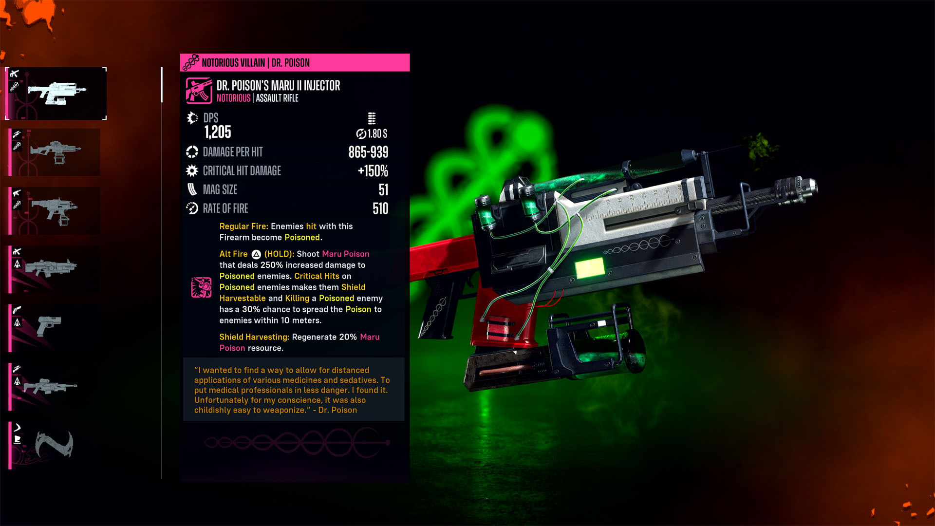 The standard fire of this weapon will Poison any enemy hit, and the alt fire will deal massively boosted damage to Poisoned enemies, making for the perfect finisher.
