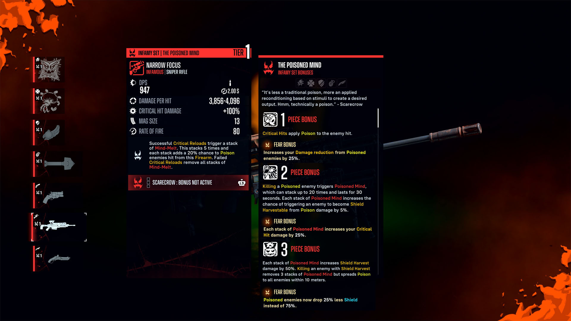 Having now teased a couple of the weapons you can expect in Season 1, we hear that you theory crafters are ailing for some more details on upcoming gear, and we’ve got just the prescription for you. The Tier 1 Scarecrow Infamy Set is focused around Poisoning enemies and increasing their Shield Harvest chance. This makes for both a great skeleton to construct a Poison build around, or a fearsome addition to a Shield Harvest build (I’m looking at you, Shark mains). In addition to all the usual powerful benefits on Infamy Sets is the ‘Fear Bonus’ which provides bonus powerful effects to each Tier during Episode 1!