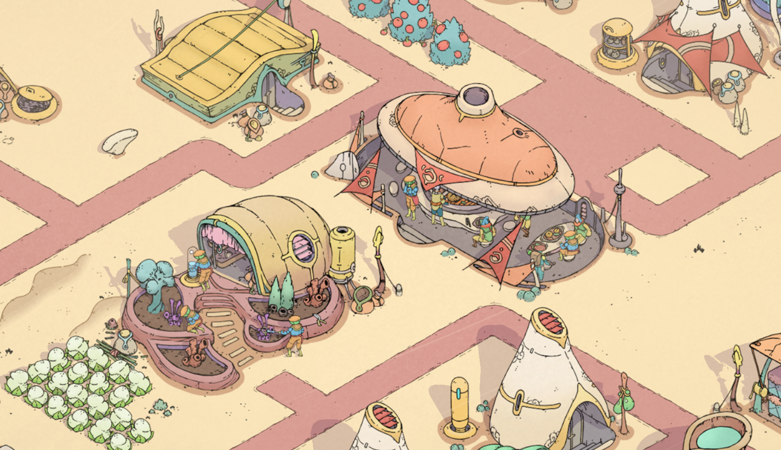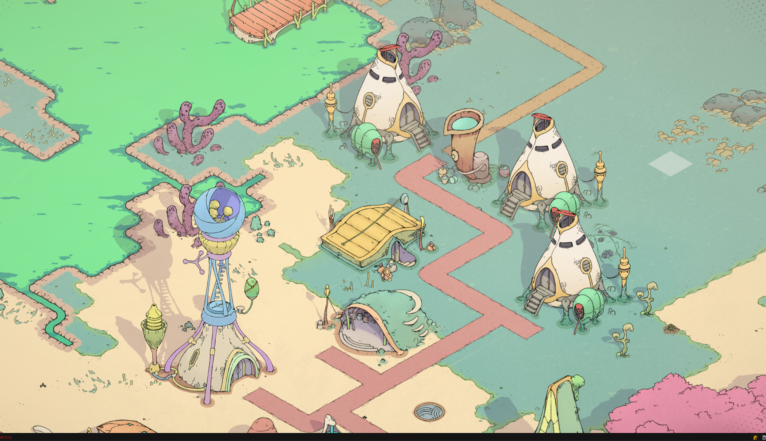 In typical 3D games, shadows are rendered by comparing the Z-buffer from the game camera to the light source's perspective. However, our depth textures are limited to the game's view, not the light source's. So, we use rays from surfaces to the light until they hit a building for shadows.