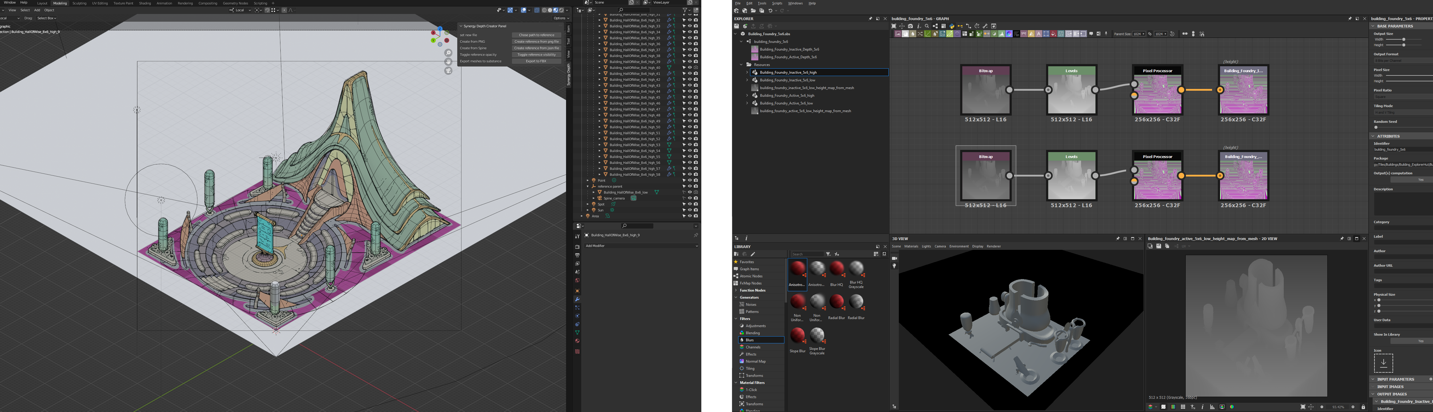 We use Blender for our 3D models, and an in-house tool makes a standardized file for each of them, ensuring consistent depth textures for all buildings. After that, we process the texture to smoothly integrate it into the engine, using a filter in Substance Designer.