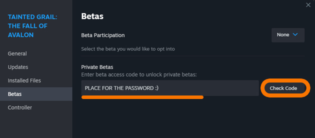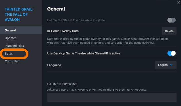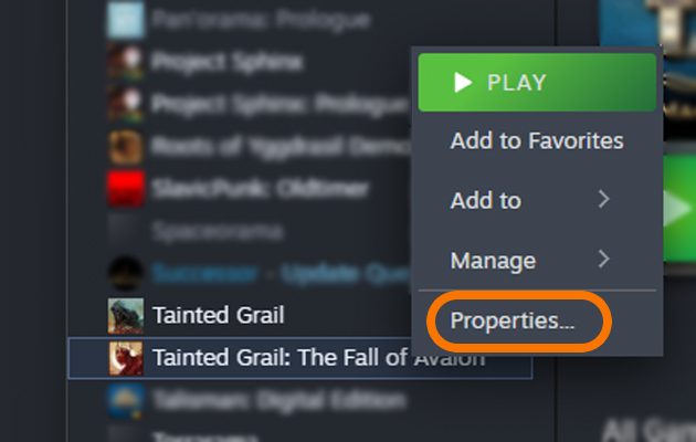 IMPORTANT! This Patch will contaminate your current save games. !IMPORTANT! Playing the beta version is easier than it may seem. [olist] [*] Firstly, locate the installed game (Tainted Grail: Fall of Avalon) in your Steam game library. [*] Next, right-click on the title to open the context menu. Select the last option from the list, which is PROPERTIES...