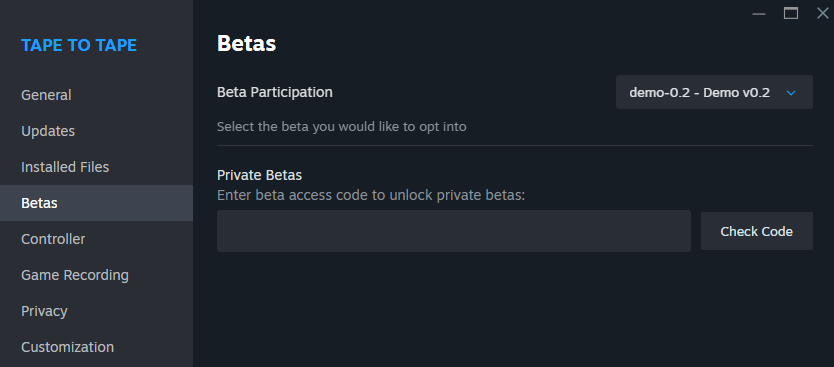 [i]To trigger the game update, a full Steam restart may be required. Also, make sure to properly switch to the Beta branch by selecting the demo-0.2 branch in the Betas section of the game’s properties.[/i]