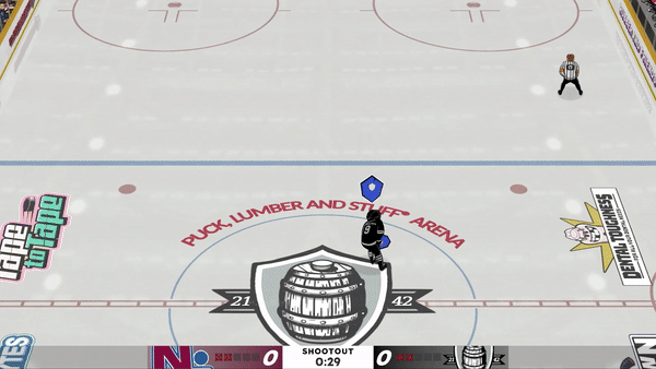 Start a shootout match from the Practice Menu. You can choose teams, the number of rounds, power-ups (ON/OFF), and manual goalies (ON/OFF).