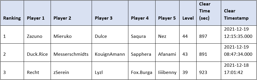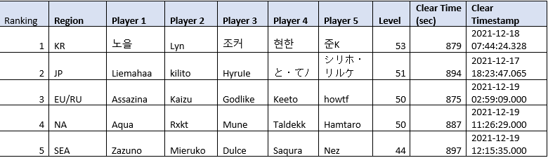 1st place: 10,000 $, Special title: 2021 World #1 Dungeon Champion, Honorary NPC in the game 2nd place: 3,000 $, Special Title: 2021 World #2 Dungeon Challenger 3rd place: 1,000 $, Special Title: 2021 World #3 Dungeon ChallengerRegional Dungeon Challenge Final Rankings