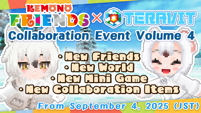 Hi everyone. This is the Teravit Operation Team. We're excited to announce that the 4th collaboration event with Kemono Friends will begin on Thursday, September 4, 2025! In this 4th volume, the Friends Arctic Wolf and Stoat make their debut in the game! A new area has been unlocked in the collaboration world 'Friends and Floating Island Memories,' and a new mini game world featuring the latest Friends is now available! A new 'Friends Chat World' will also be available, letting you enjoy voice chats while experiencing the world of Kemono Friends!