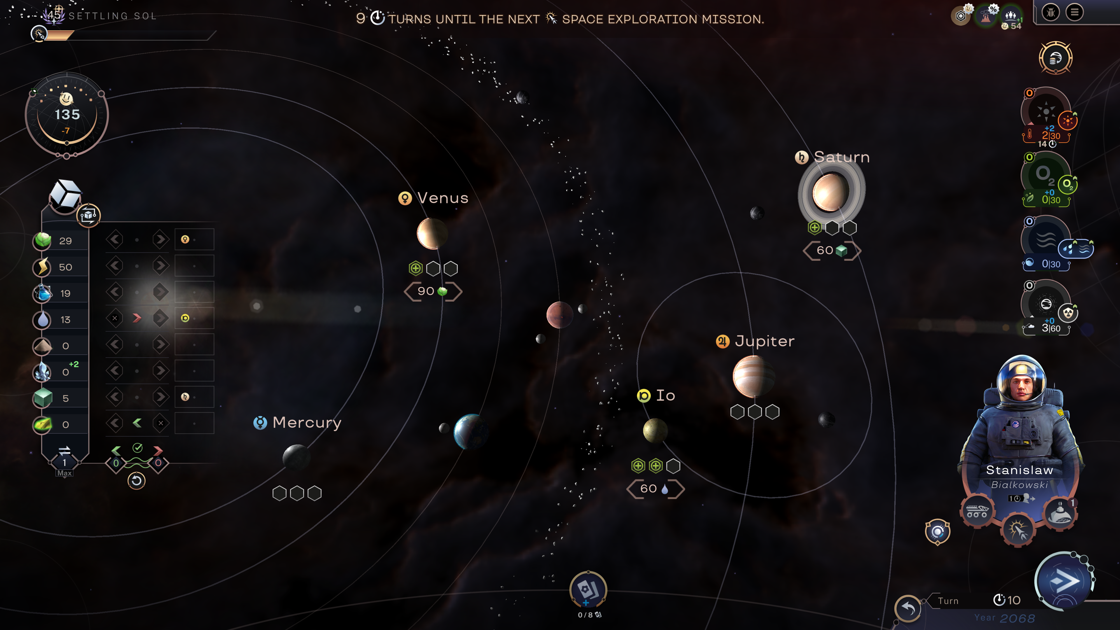 After you’ve completed a celestial development project, you can choose which celestial body you want to develop. Every celestial body has 3 stages, and each stage gives different bonuses back to Mars. These can be resources, passive effects or unique buildings.