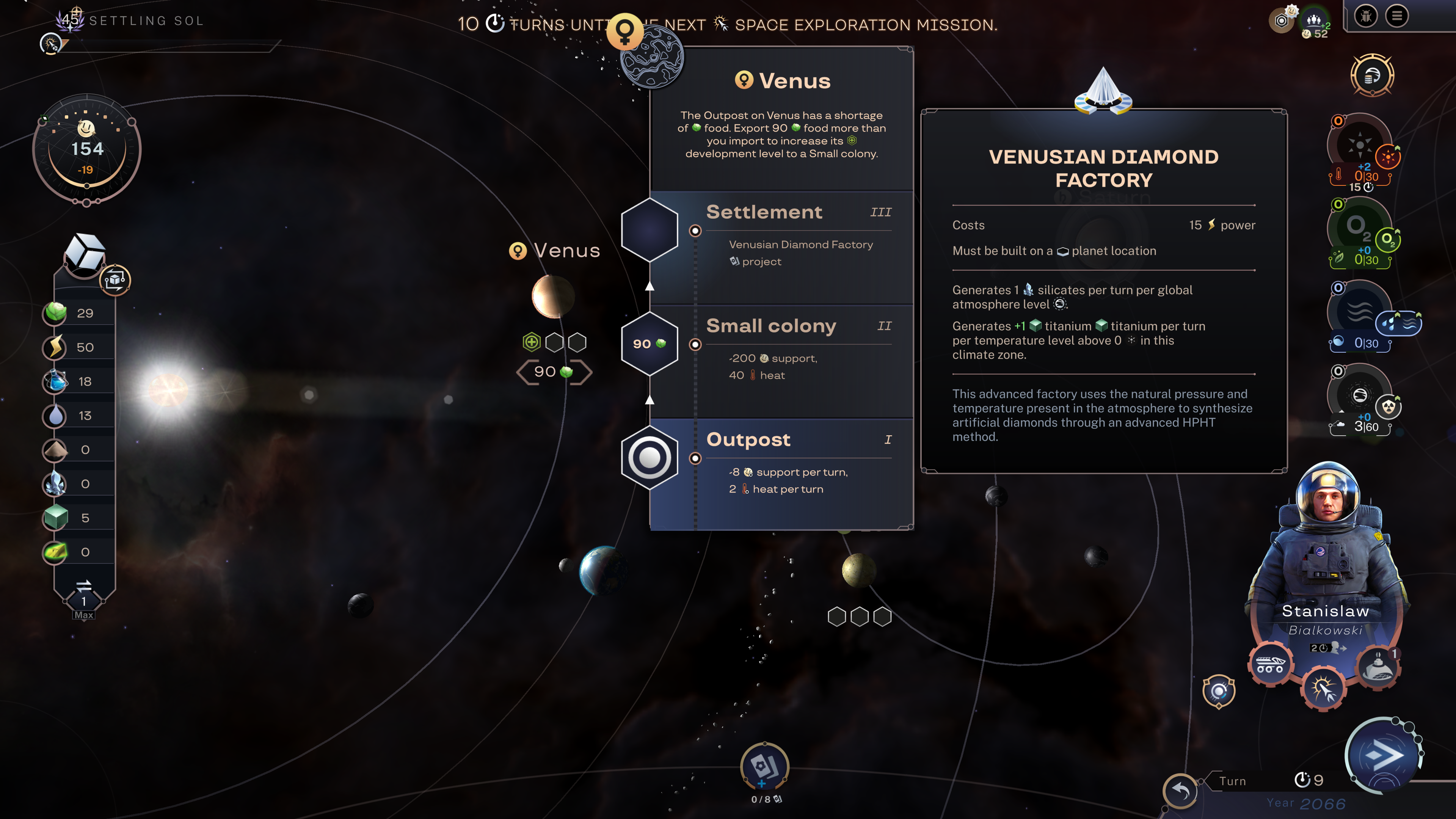 To develop a celestial body, you must complete one of the new celestial development space projects and select a celestial body to develop it on. Some of these new projects have specific requirements or bonuses, for example, heating habitats that only work if the celestial body is located further from the sun than Mars is.