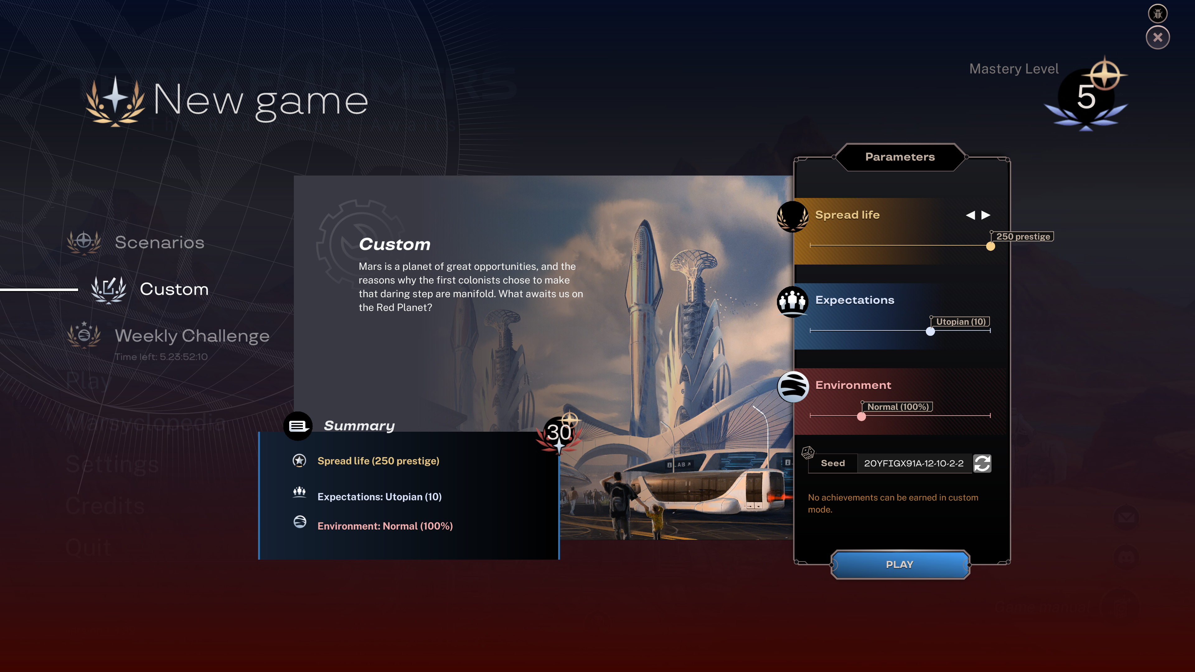 As many of you requested, we’ve also added all the scenario goals to the custom mode. You can now freely choose any goal that you want to pursue. The custom goals can also be set higher than the final scenario goals. So you are now free to make any combination of goal, expectation, and environment difficulty you like.