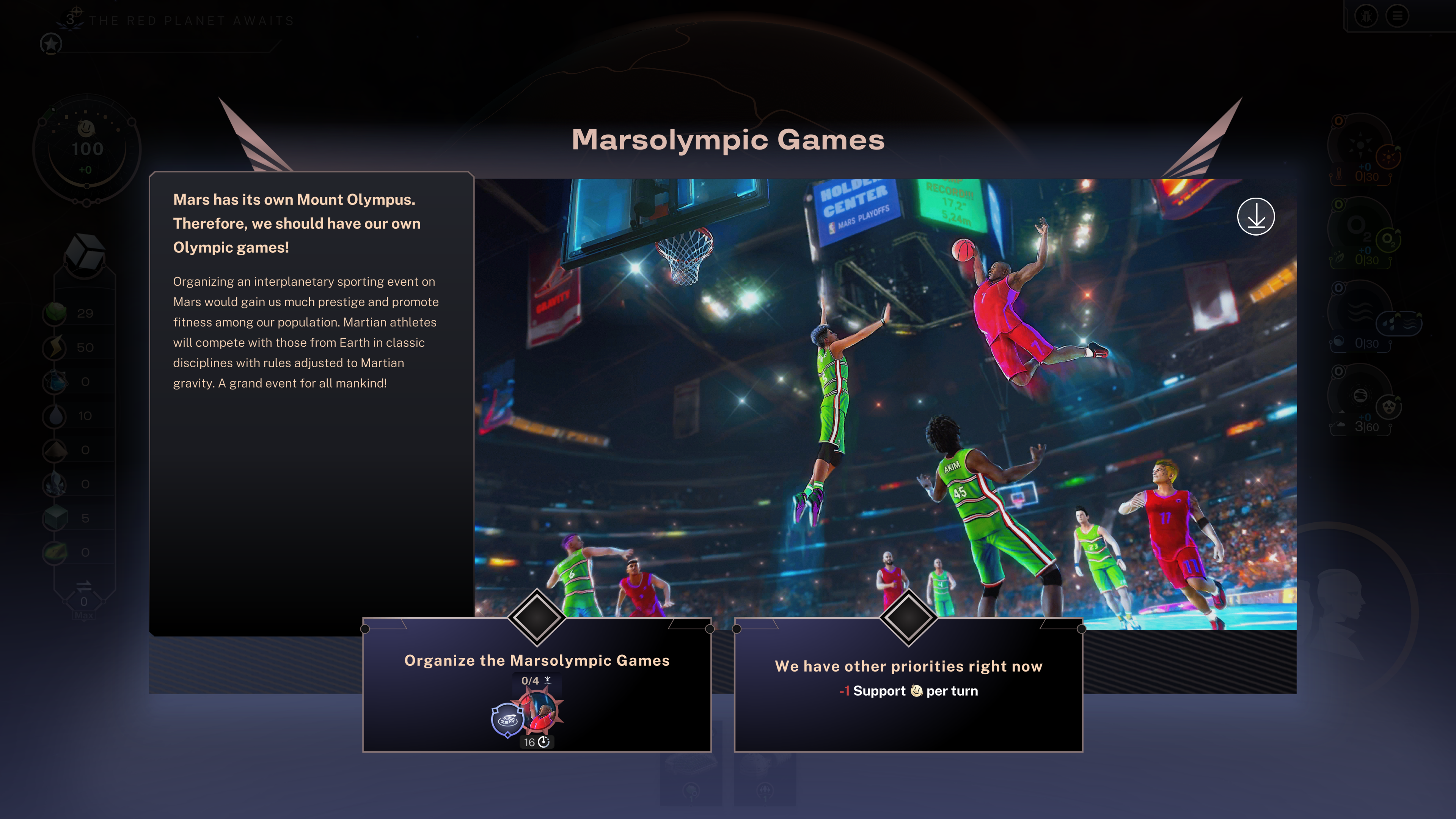 In this free update we’ve added a new event in which you’ll have the option to organize the Marsolympics. If you do so, you must train more athletes than Earth will send in order to keep the majority of the gold medals on the Red Planet. Winning the Marsolympics will result in a global comfort of living increase until the next Marsolympics while losing will result in a global comfort of living decrease until the next Marsolympics. New Marsolympics editions will be held every 8 turns and allow both planets a chance at prolongation or revanche!