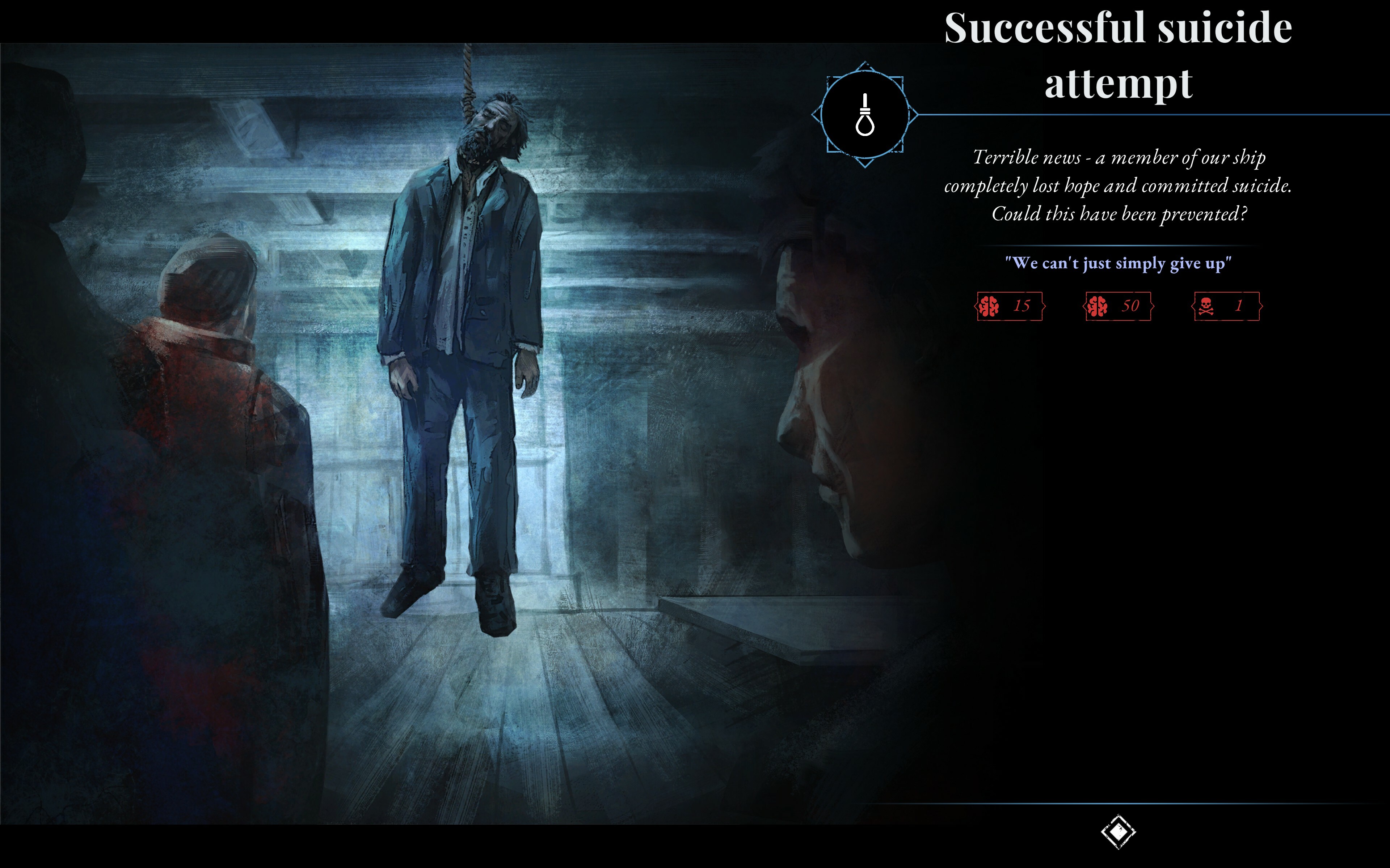 However, what good is having the most loyal crew when each member is out of their mind? Frost, resource shortages, and eternal darkness are a direct path to losing one's senses. You must know today that every person has a limit beyond which their sanity breaks like a matchstick. And then, you can see firsthand that demons do not exist; they were only created by humans in their own hidden likeness...