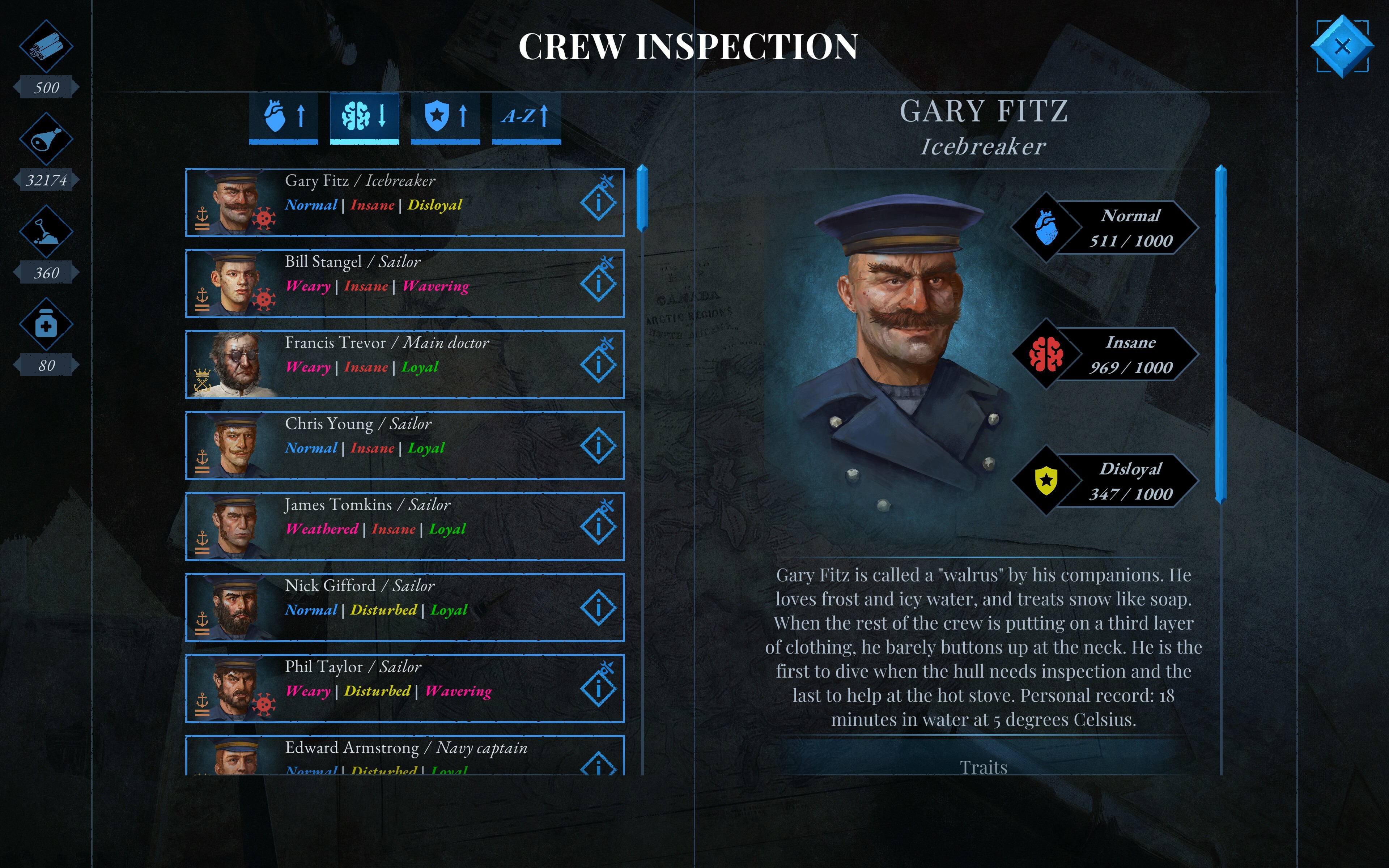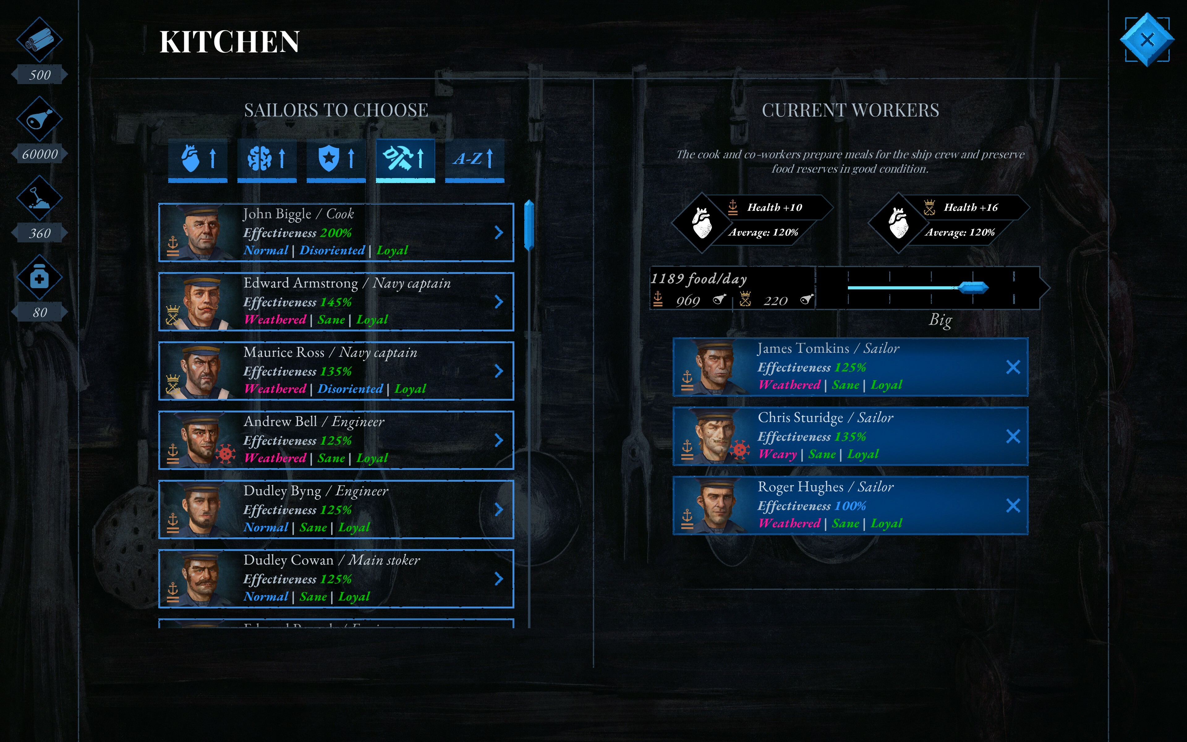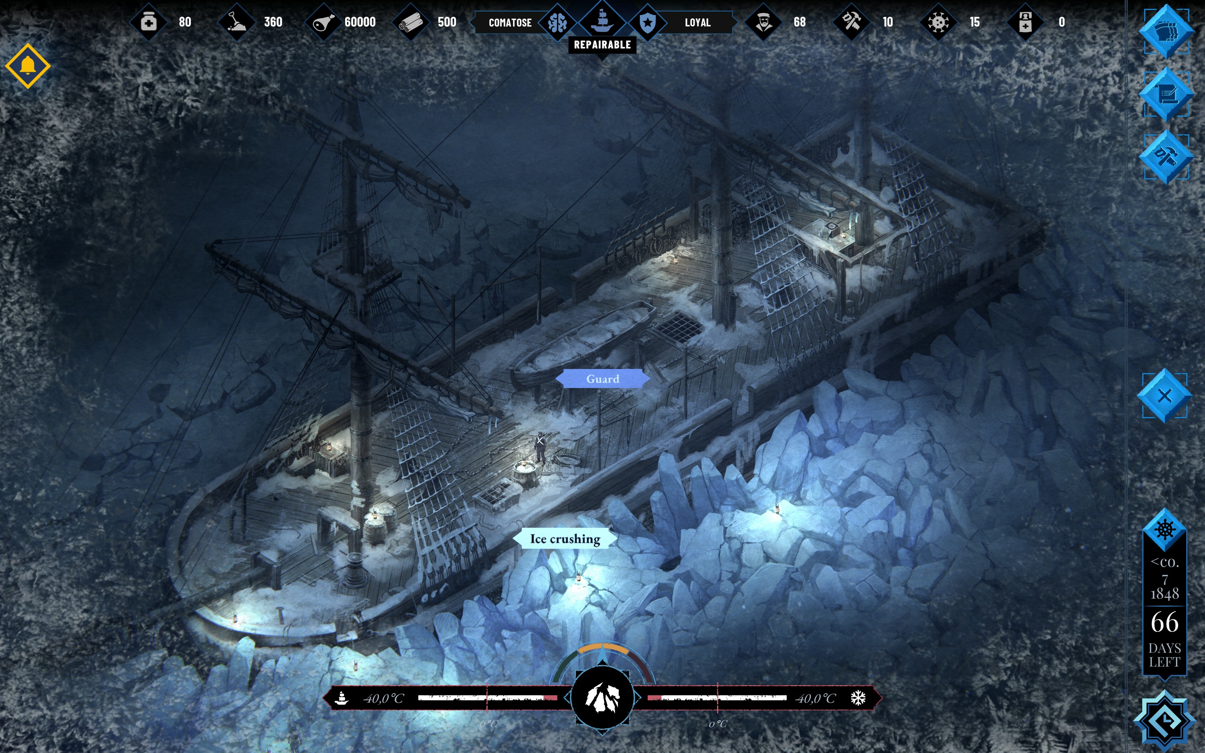 Resources are not just coal but, most importantly, food. Without food, the crew will perish faster than anyone can think of any plan to return. When leaving England, you took more supplies than necessary, but if you don’t find a way to properly manage the food, it will quickly run out. Unless you organize a way to obtain meat in this icy land where God has forgotten about morality...