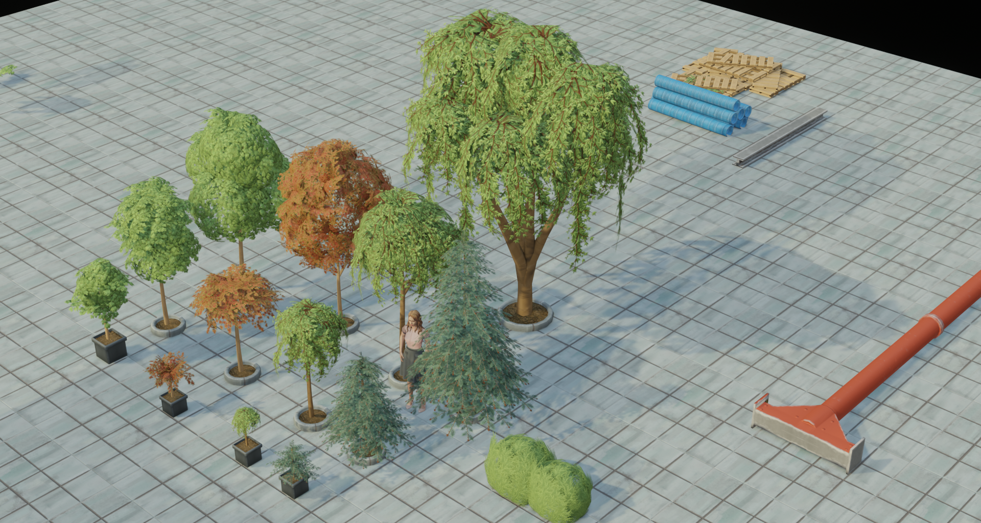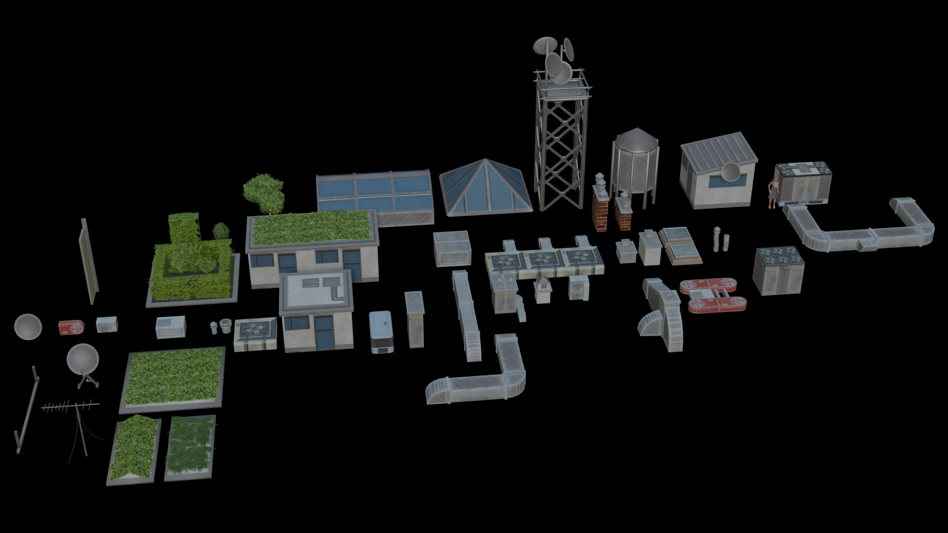 First, we've been working on all the [b]equipment, materials, and props[/b] used on the building plots. On top of that, we've got close to a thousand assets to prepare for our [b]city-building generation pipeline[/b]. Below you can see the roofing decorations we've got so far.