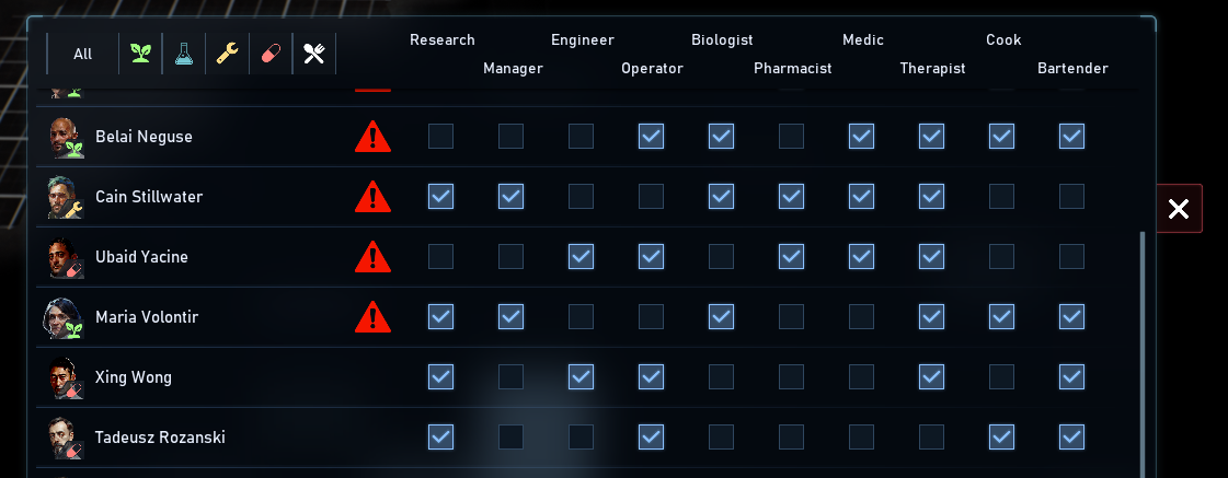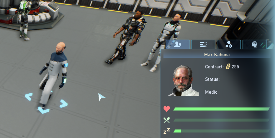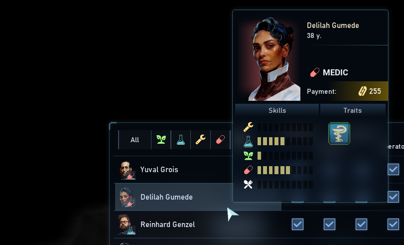 Each colonist's efficiency is determined by various modifiers: skill level, physical and psychological condition, temporary effects like "injured" or "inspired." Colonists also received customization options with diverse skin colors and hairstyles.