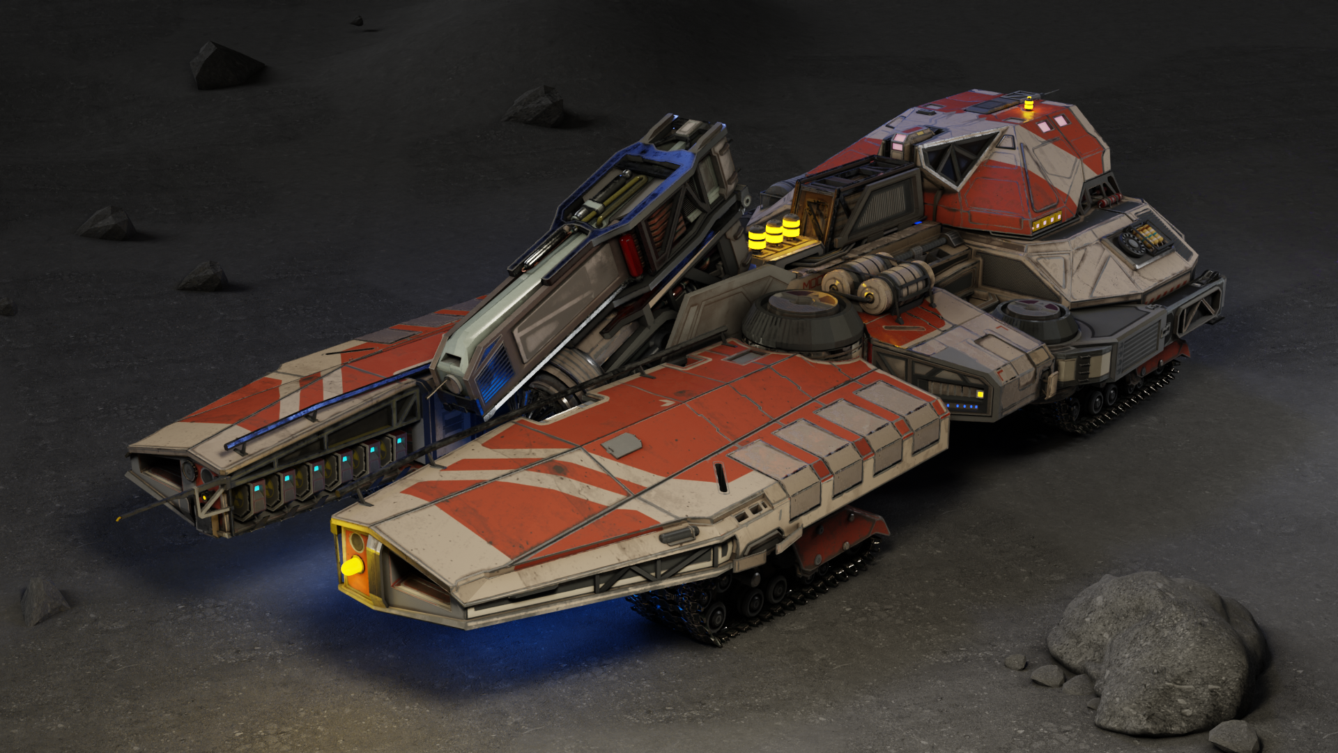 A new drone specializing in transporting large volumes of resources and collecting regolith after excavations. It handles heavy logistics tasks, saving time for standard drones. Unlike a standard robot that carries only one unit of cargo, the Hauling Drone has a cargo compartment for 10 units, but its speed is reduced due to the use of a tracked chassis. The large cargo compartment allows it to collect large amounts of regolith without returning to storage, unlike standard robots.