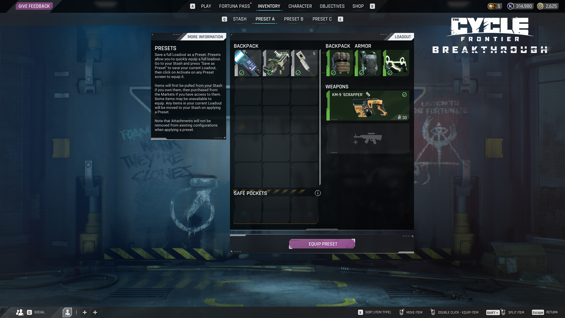 This is a long requested feature and we are happy to finally give players a way to equip everything they need for their planet-side ventures with one click. You can customize your preset loadouts with your favorite or most-used gear in the stash section of your inventory. When selecting a preset loadout to equip, any weapons, armor, helmets, ammo or other consumable items will be equipped directly from your stash. Any items that are not your stash will be purchased from the appropriate faction HQ automatically, with a popup asking you to confirm said purchase. New descriptions and UI sections have been added to properly teach you how to assemble and equip a preset loadout. When viewing a preset loadout before equipping, icons will display which items are currently available from a player's inventory, which items need to be purchased, and which items are unavailable. Use this feature to quickly get back into the action between runs and spend less time running between the faction shops to pickup the gear you need to achieve prospecting glory.