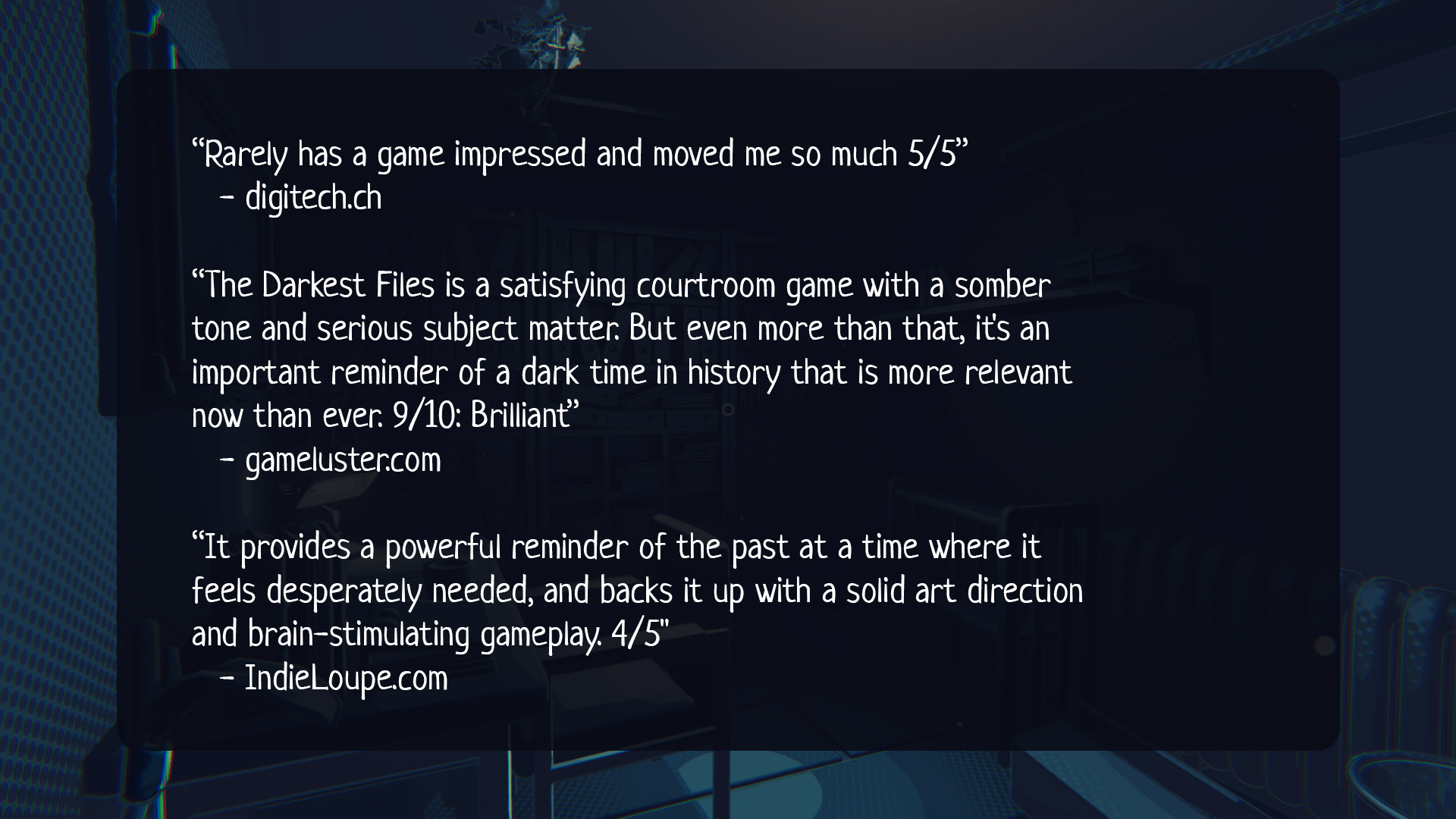 - [b]Adjusted the difficulty[/b] of Investigator Mode to make it a little easier. (Removed the requirement to specify the paragraph in a given document and enabled the counter in the testimonies that shows how many optional interactables have been found). From the feedback we received, we feel that this more closely reflects the kind of "normal" difficulty that people are looking for - whereas in our minds, "Investigator Mode" was always designed to be "Hard Mode".