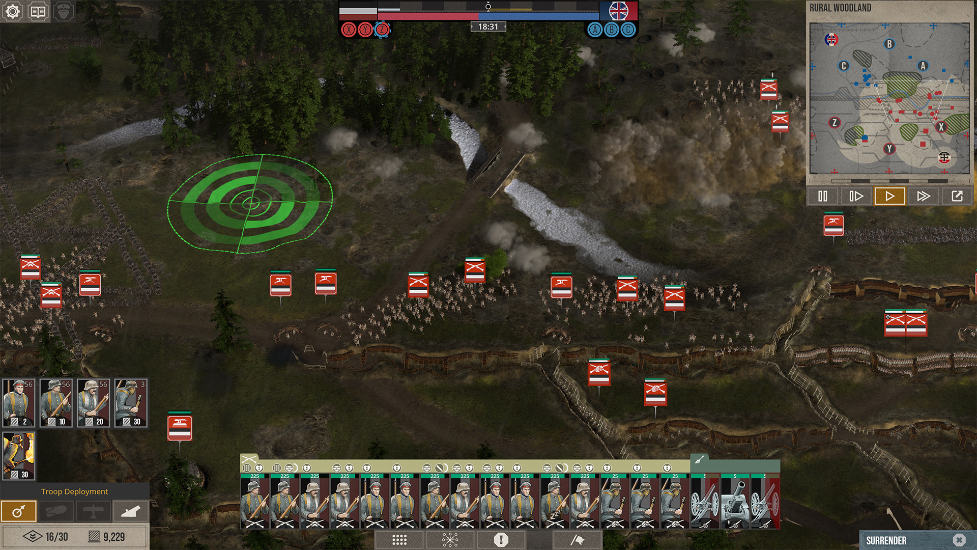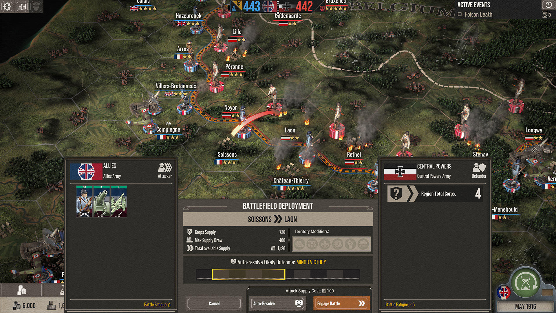 Depending on whether you’re attacking or defending in a battle, the tactics you employ and where you choose to allocate your supply will make the difference between victory and defeat. When on the defensive, a strong trench network and emplacements are key. Deterrents such as barbed wire can be deployed once researched, slowing the enemy’s troops as they attempt to cross No Man’s Land. MG Nests and reinforced trenches will provide you a solid front to protect as the enemy attempts to breach. When attacking the enemy’s territory, remember that whilst only a Great Victory will reduce the number of stars in the region, even a minor victory will impact their National Will. Your foe will also look for opportunities to counter-attack, so ensure you are on your guard!Managing Your Forces on the Battlefield