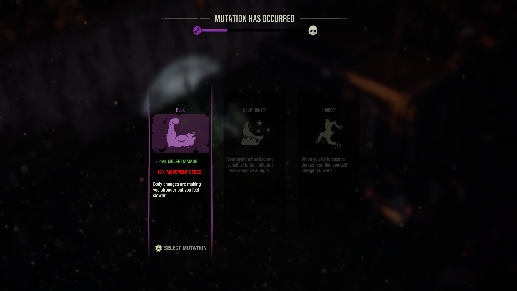 This week, we wanted to talk a bit about one of the game's core mechanics; mutations. As your character's infection level progresses, it cuts your maximum health, but it can also have potent benefits. When it reaches certain points, you'll be given a choice of several effects.