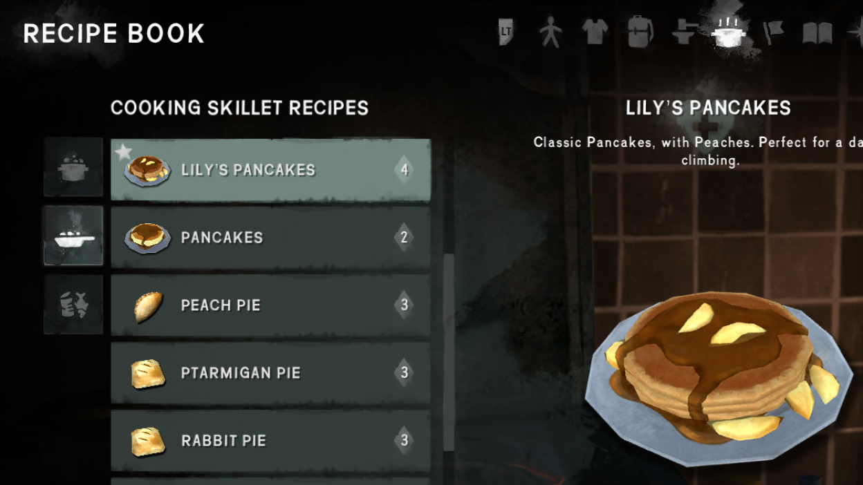 One of the big additions in Part Three is a new feature called Frontier Cooking. We’ve added seven new ingredients to the game, and now with Recipes you can cook more complicated foods that involve multiple ingredients -- things like Rabbit Stew, Fish Pies, and so on. The Frontier Cooking system is launching with 15 Recipes, as well as 9 Unique recipes that can be found in the world. We’re also adding a Skillet to enable new cooking options, and completely overhauled the Cooking user interface.