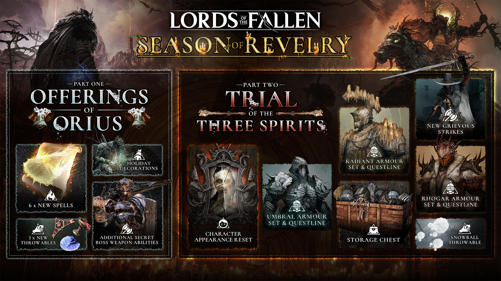 As the holiday season dawns once more, we find ourselves reflecting on the joy and adventure we’ve shared with the [i]Lords of the Fallen[/i] community. Last December, we celebrated together with the [i]Season of Revelry[/i], a two-part event filled with festive cheer and thrilling challenges. For those who joined us, the echoes of [i]Offerings of Orius[/i] and the [i]Trial of the Three Spirits[/i] still resonate: Snowballs were thrown, trials were conquered, and secrets were uncovered…