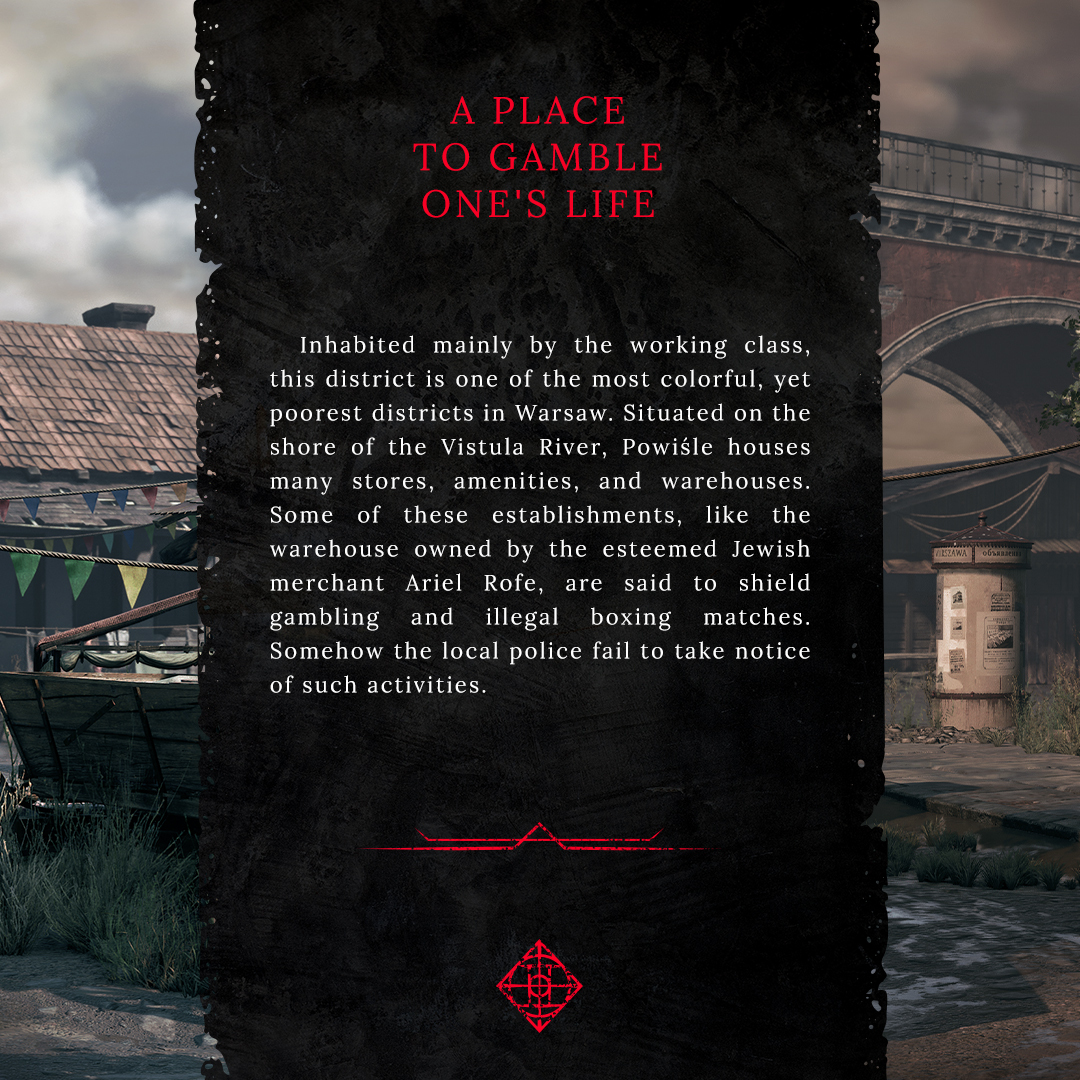 Inhabited mainly by the members of the working class, this district is one of the most colorful, yet poorest districts in Warsaw. Situated on the shore of the Vistula River, Powiśle houses many stores, amenities, and warehouses. Some of these establishments, like the warehouse owned by the esteemed Jewish merchant Ariel Rofe, are said to shield gambling and illegal boxing matches. Somehow the local police fail to take notice of such activities.