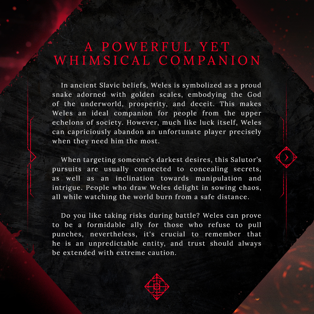 Weles can prove to be a formidable ally but it's crucial to remember that he is an unpredictable entity, and trust should always be extended with extreme caution. In ancient Slavic beliefs, Weles is symbolized as a proud snake adorned with golden scales, embodying the God of the underworld, prosperity, and deceit. This makes Weles an ideal companion for people from the upper echelons of society. However, much like luck itself, Weles can capriciously abandon an unfortunate player precisely when they need him the most. When targeting someone’s darkest desires, this Salutor’s pursuits are usually connected to concealing secrets, as well as an inclination towards manipulation and intrigue. People who draw Weles delight in sowing chaos, all while watching the world burn from a safe distance. Do you like taking risks during battle? Weles can prove to be a formidable ally for those who refuse to pull punches, nevertheless, it's crucial to remember that he is an unpredictable entity, and trust should always be extended with extreme caution.